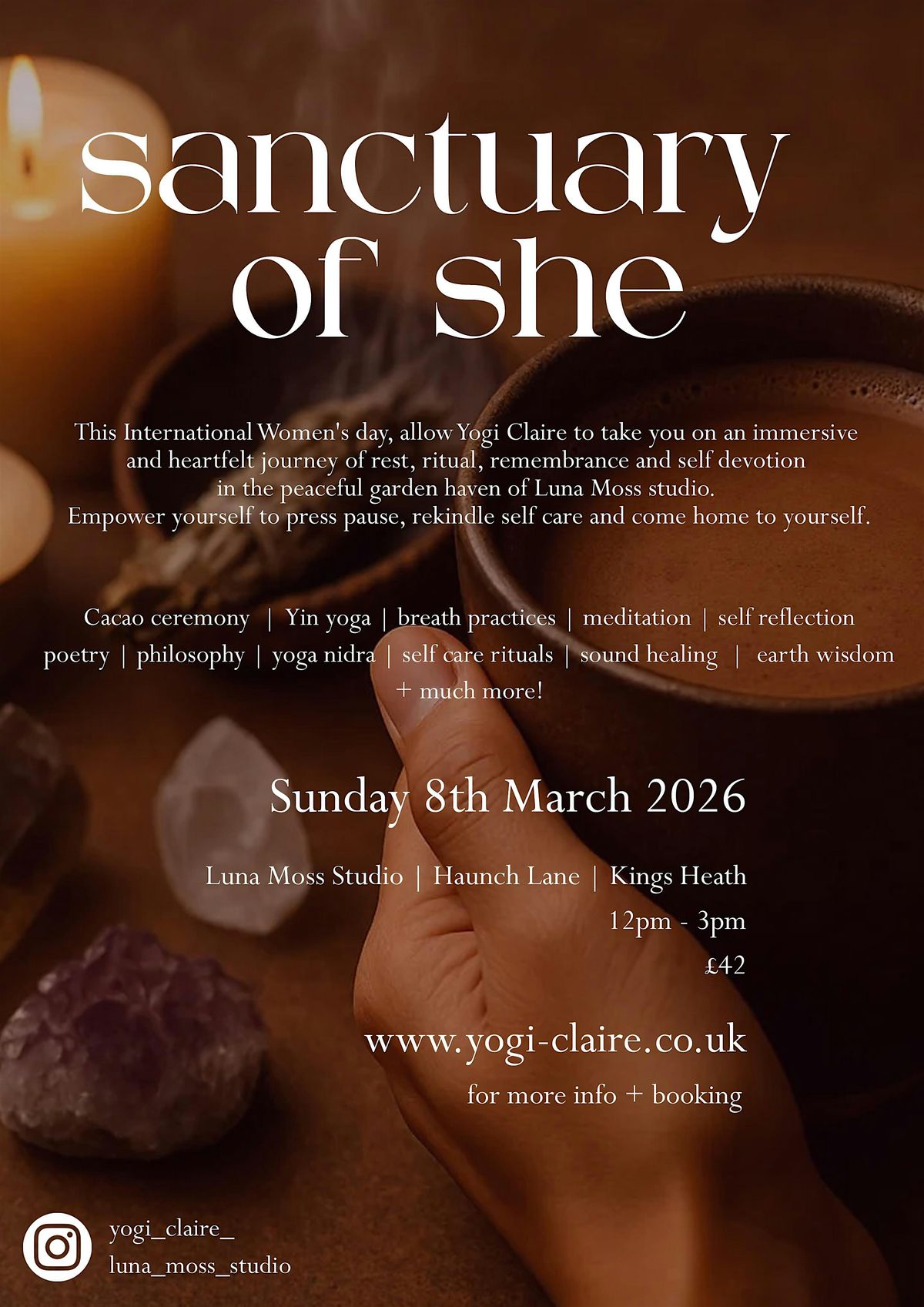 This International Women's day, allow Yogi Claire to take you on an immersive and heartfelt journey of rest, ritual, remembrance and self devotion in the peaceful garden haven of Luna Moss studio. Empower yourself to press pause, rekindle self care and come home to yourself.