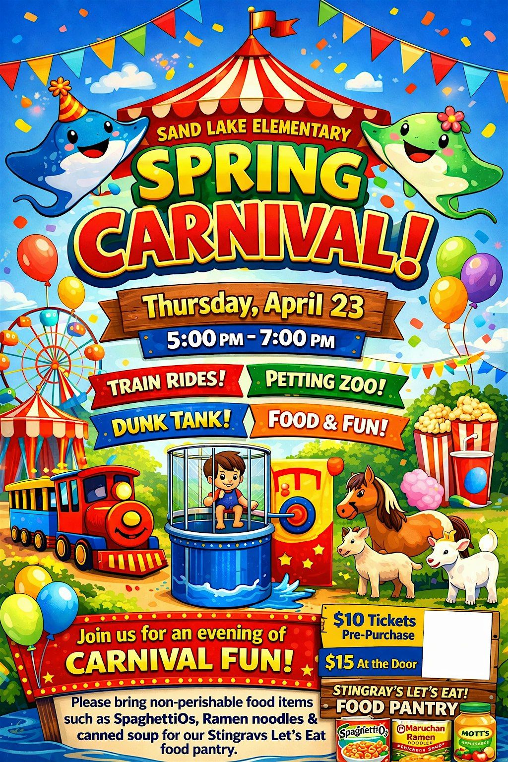 Join us at Sand Lake Elementary School for a fun-filled evening on April 23, 2026 at 5:00 PM (Eastern Time)! Bring your family and friends to enjoy games, food, and great company. It's the perfect way to celebrate spring and support our school community. Don't miss out on the laughs and excitement — see you there!