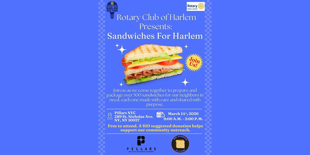Serve with Rotary Club of Harlem as we come together to address food insecurity in our community - One Sandwich At a Time. Lend your hands to help prepare over 500 sandwiches for neighbors who need them most. Join us in showing up for Harlem through meaningful, hands-on service.