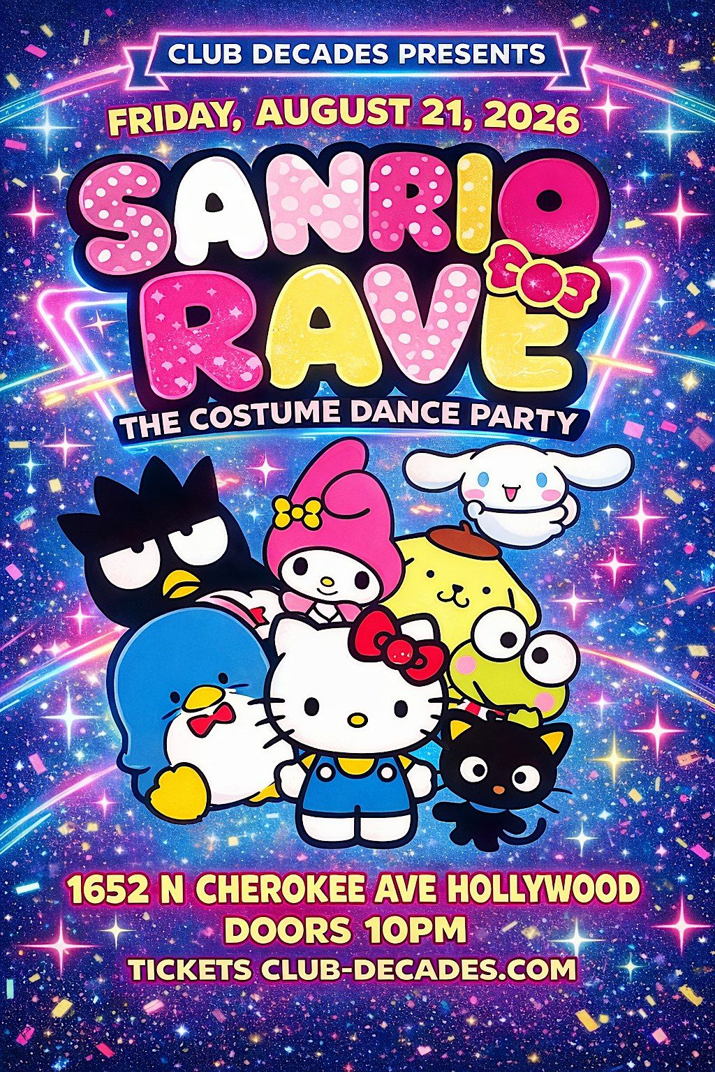 Join us for SANRIO RAVE: The Costume Dance Party at Club Decades β a kawaii night celebrating Hello Kitty & friends with DJs, dancing, and the cutest rave in Hollywood.