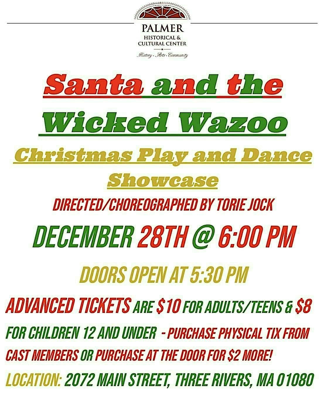 Let's stay in the Christmas spirit with this charming performance of Santa and the Wicked Wazoo! Accompanied by Christmas dances and a magic show! Advanced tickets are $8 for children 12 and under and $10 for adults. Door tickets are $10 for children 12 and under and $12 for adults! Concessions and pizza will be sold during event! Pizza sales all go towards our fundraiser for our big performance of, Charlotte's Web, this spring!