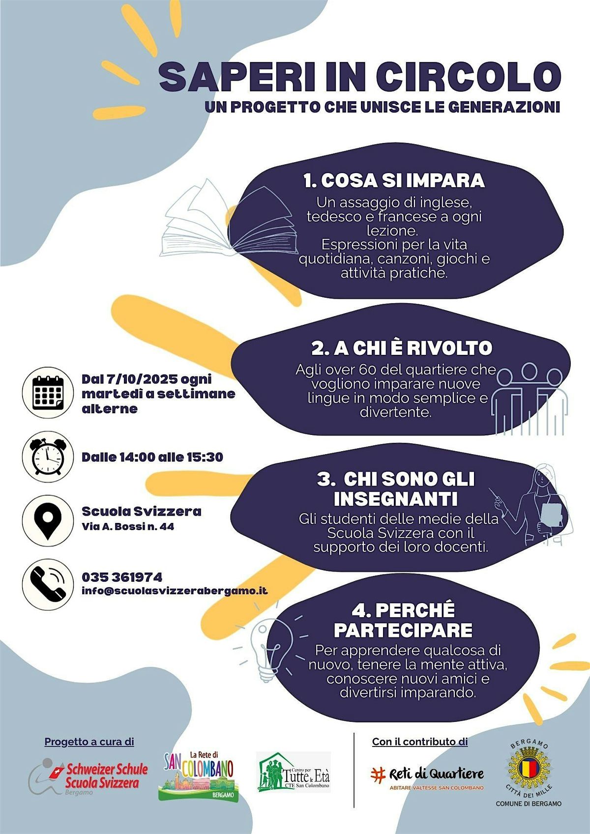I ragazzi della Scuola Svizzera Bergamo, guidati dalle loro docenti madrelingua, terranno dei corsi di Tedesco, Inglese, Francese per tutti gli OVER 60 del quartiere. Le iscrizioni al corso di lingue sono ufficialmente aperte - E-mail: [email protected] !!!