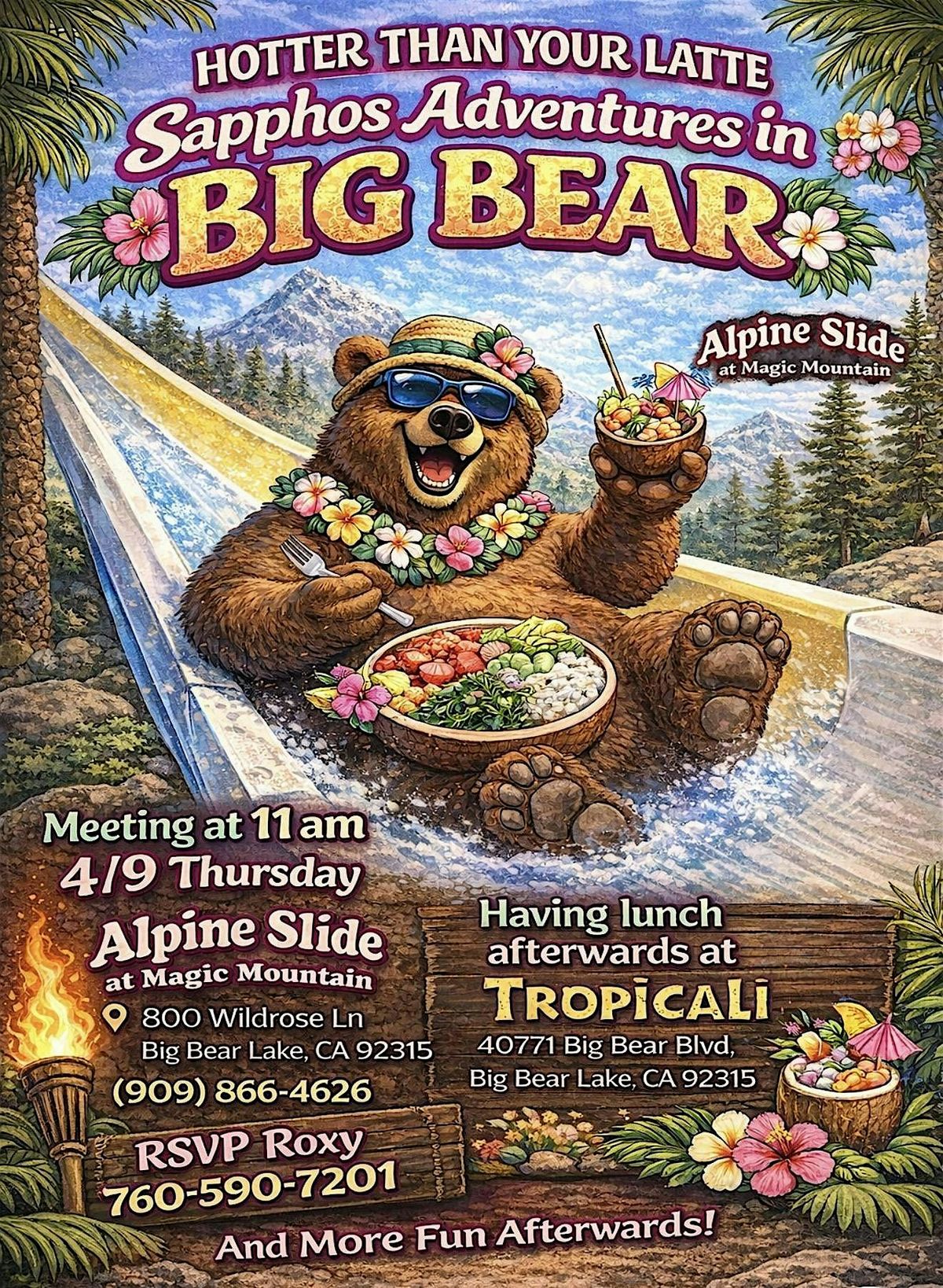 Get ready for an epic day out in person at Alpine Slide where thrills await! After carving down the slides, we'll chill and refuel with a tasty lunch at Tropicali. Perfect vibes, great company, and unforgettable memories – join us FOR BUILDING COMMUNITY AND for the adventure! For Sapphos, WLW, Queer Women and LGBTQIA+