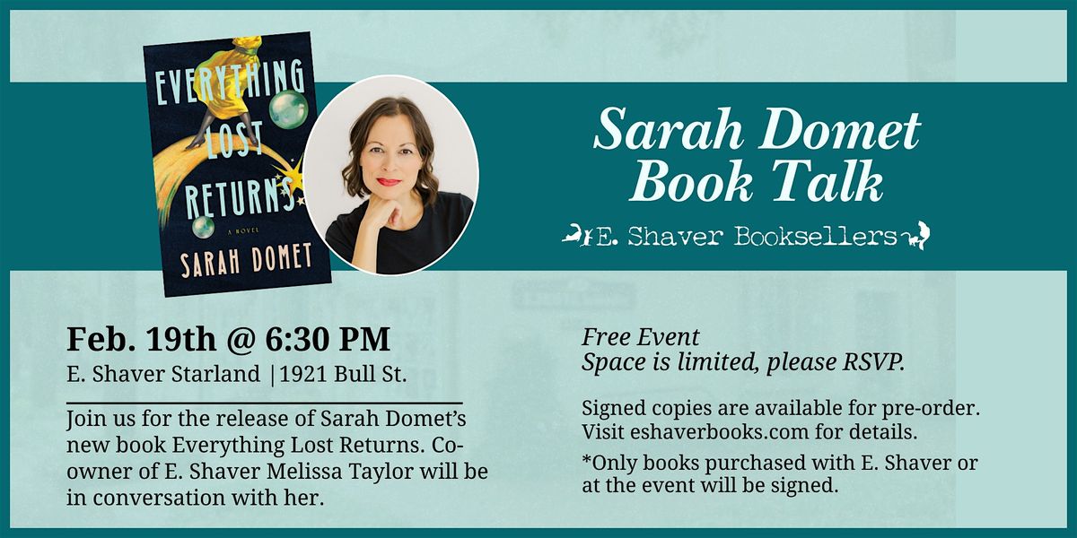 Join us for the release of Sarah Domet’s new book Everything Lost Returns. Co-owner of E. Shaver Melissa Taylor will be in conversation with her.