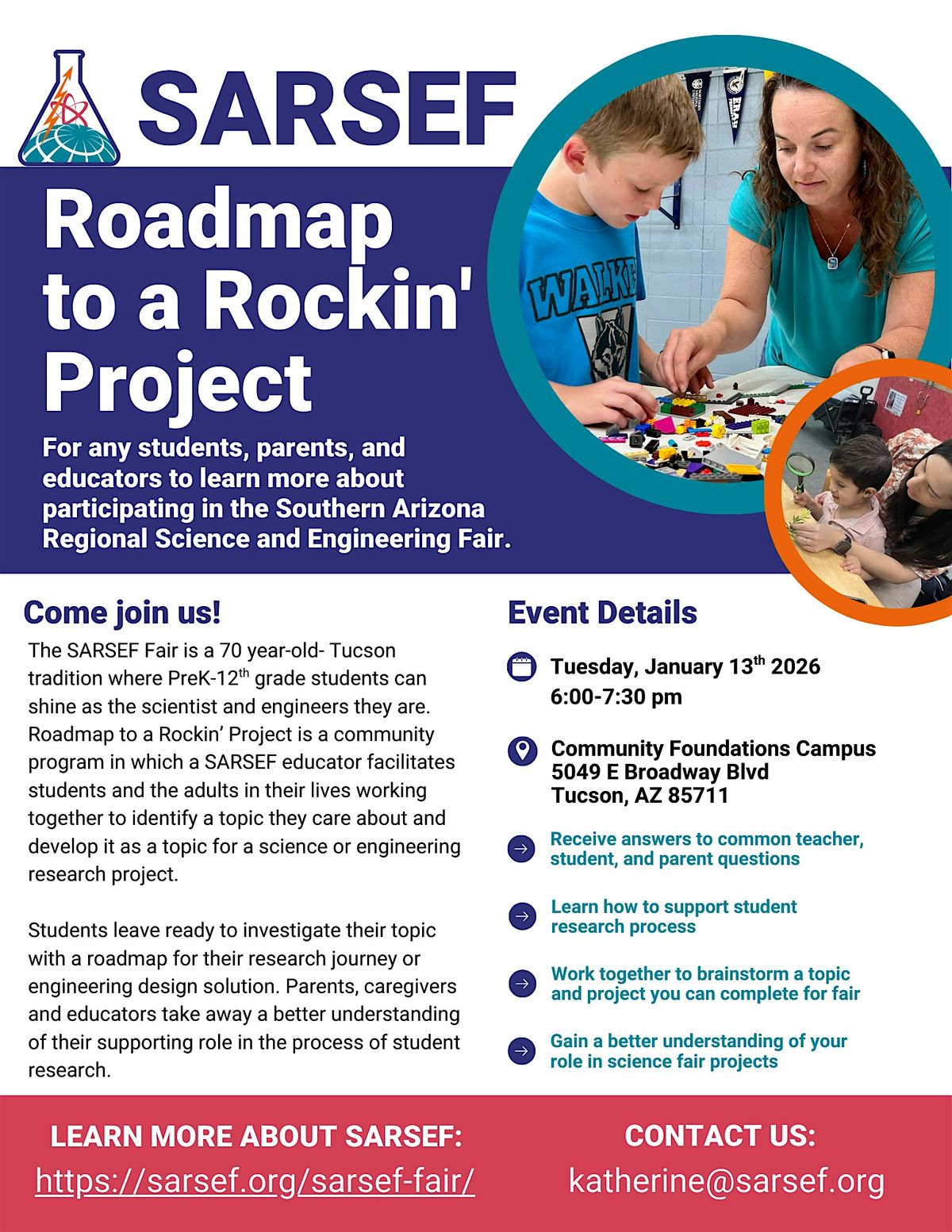 The SARSEF Fair is a 70 year-old- Tucson tradition where PreK-12th grade students can shine as the scientist and engineers they are. Roadmap to a Rockin’ Project is a community program in which a SARSEF educator facilitates students and the adults in their lives working together to identify a topic they care about and develop it as a topic for a science or engineering research project.