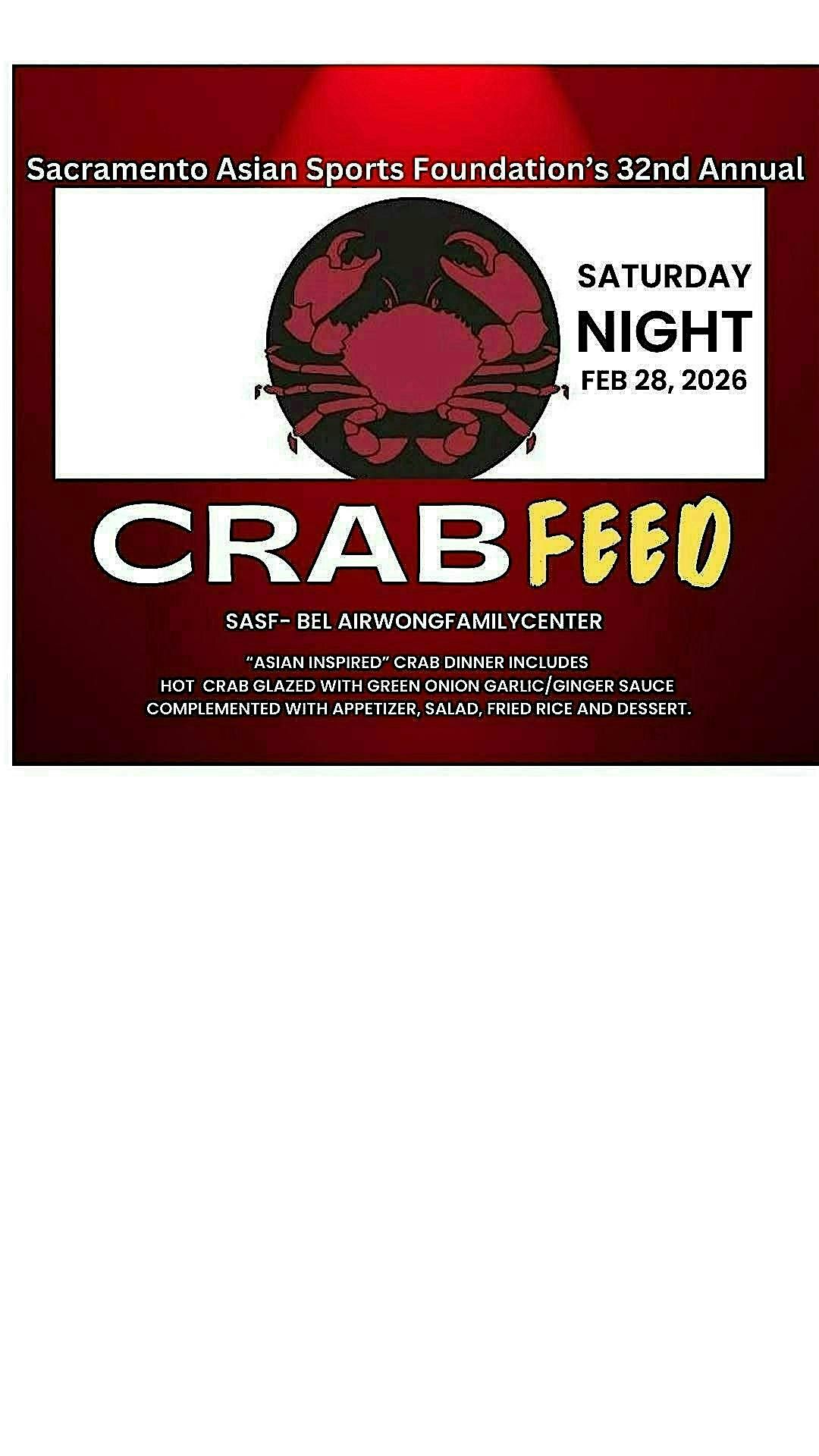 Info: Join us for an unforgettable evening at the Sacramento Asian Sports Foundation! The night kicks off at 5:00 PM with no-host cocktails, followed by our delicious Crab Feed Dinner at 6:00 PM, featuring Asian-inspired crab, appetizers, fried rice, salad, and dessert. From 5:00–8:00 PM, our volunteers will be selling spots for the exciting "Last Man Standing" Board. The evening concludes with dessert and an 8:00 PM Live Auction, where you can bid on incredible prizes, experiences, and Airbnbs. Don’t miss this fun-filled night of great food, entertainment, and community spirit!