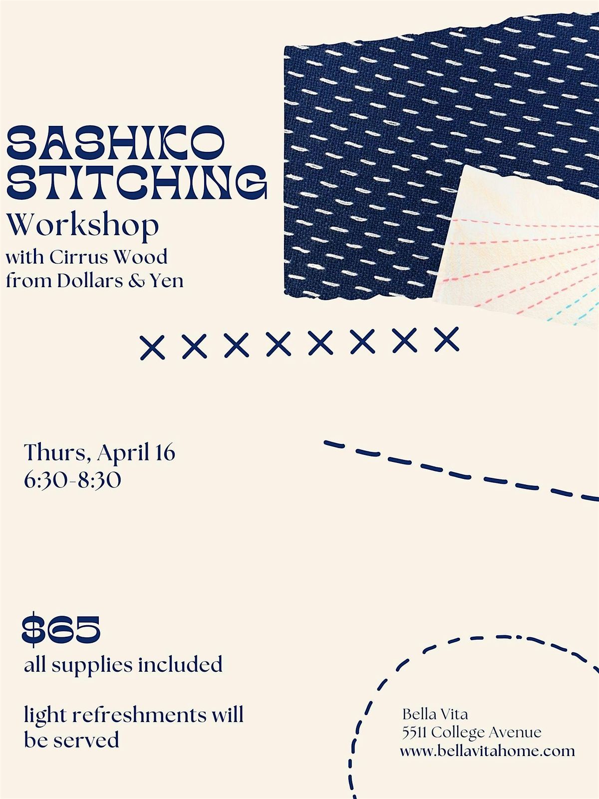 Come learn sashiko at Bella Vita! Sashiko is a form of Japanese clothing repair that's both beautiful and functional. These small, strong stitches can add years to the life of a garment and can be applied in all manner of dynamic, eye catching patterns. In this two hour class, students will learn the fundamentals of sashiko and - hopefully ! - leave feeling prepared and inspired to deploy what they've learned throughout their wardrobe. All supplies will be provided and can be taken home at the end of class. This class is suitable for attendees ages fifteen and older, and for children age 10 through 14 who are eager to learn alongside a paying accompanying adult :)