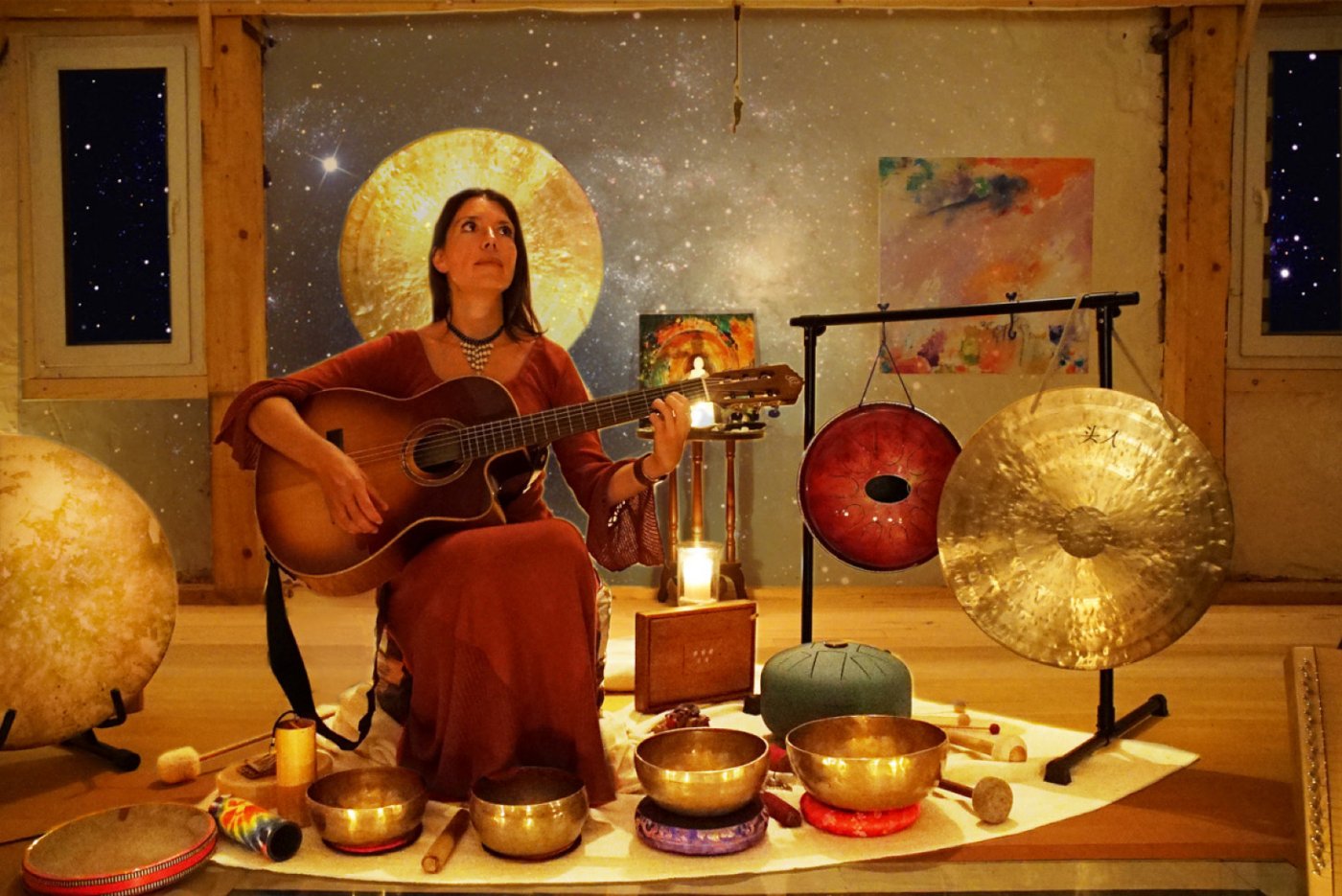 Die schamanisch inspirierte Sängerin & Musiktherapeutin spielt mit den reichen Facetten ihrer Stimme und Klang-Instrumente, die verschiedenen Kulturen der Erde entstammen, wobei sie magische Atmosphären kreiert, die Leichtigkeit und Tiefe verweben, dabei innere Räume exploriert, die Brücken bilden zwischen konkreter Erdhaftigkeit und der Unendlichkeit