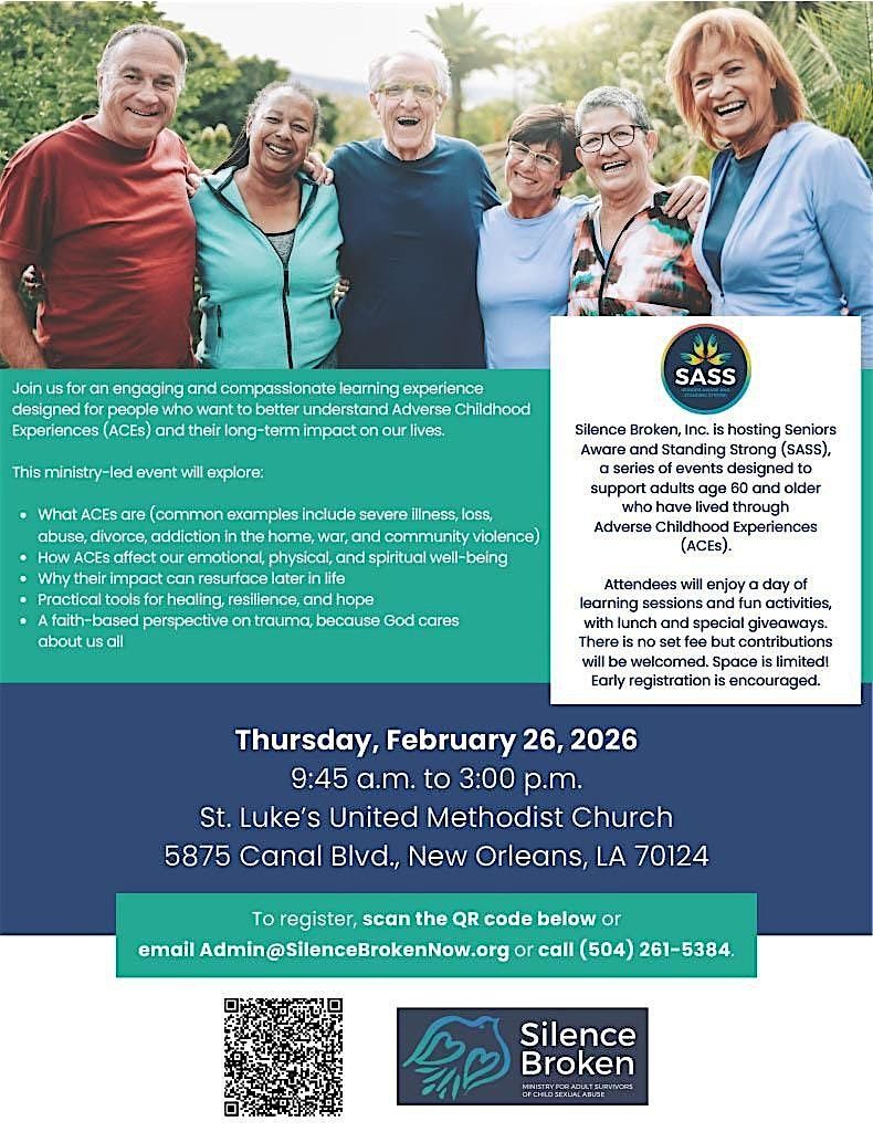 Silence Broken, Inc. presents SASS - Seniors Aware & Standing Strong! Silence Broken is a 501c3 non-profit organization that facilitates loving, truth-based ministry for adult survivors of childhood trauma. SASS is a free 6-part series that will happen throughout the year to offer survivors insight and coping tools in a supportive, fun, and loving environment. The inaugural event will be a full day filled with fellowship, resources, and creative activities.