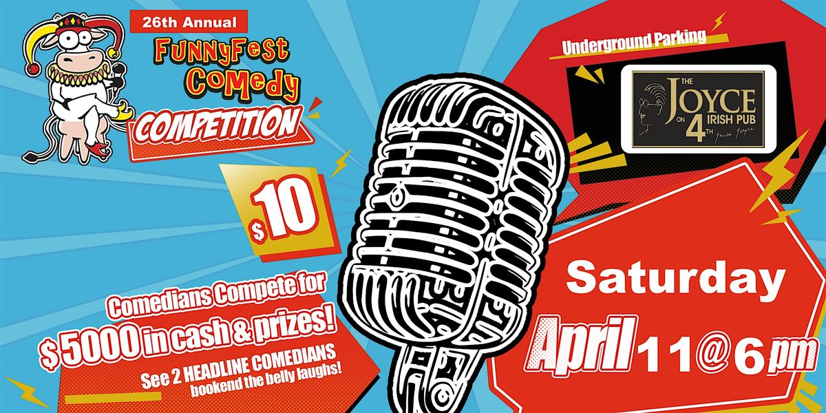 Laughs, Food and Drinks at 26th Annual FunnyFest COMEDY COMPETITION - Competitors try to WIN $5000, plus see 2 Headliners - JOYCE on 4thAbout this Event