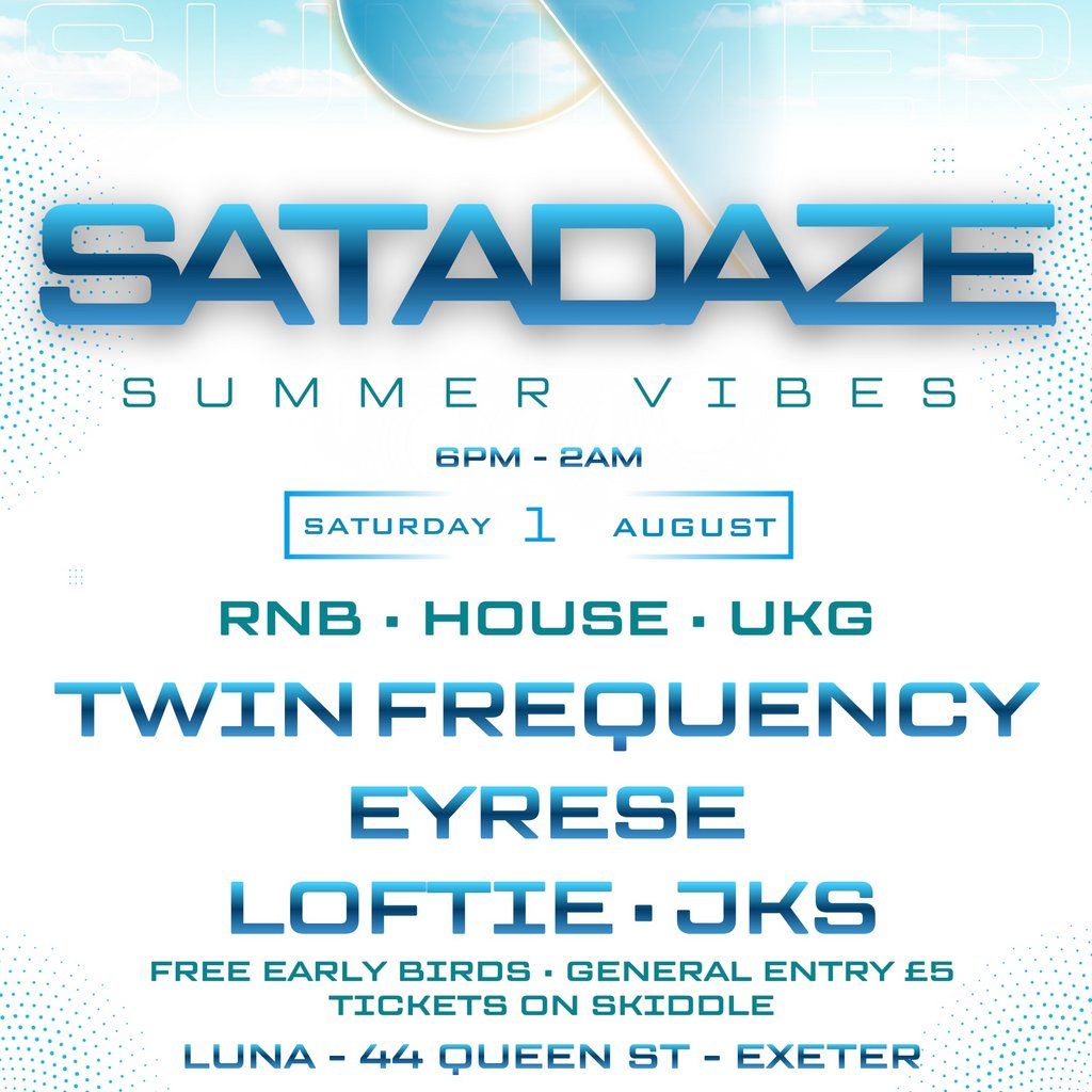 Satadaze Summer Vibes hits Exeter with Twin Frequency, Eyrese, Loftie & JKS spinning RnB, House & UKG. Free early birds, £5 general entry, 1/8/26Music Genres : House, UK Garage, R&B
