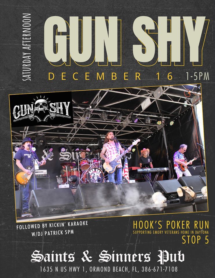 Gun Shy will ROCK Saints & Sinners Pub on Saturday, December 16 from 1-5 pm. Hook's Poker Run final stop!They will be followed by Kickin' Karaoke with DJ Patrick starting at 5pm.