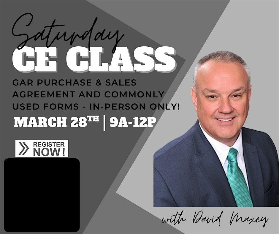 Join us on Saturday, March 28th from 9a-12p for GAR Purchase & Sales Agreement and Commonly Used Forms 1 CE Class with David Maxey.
