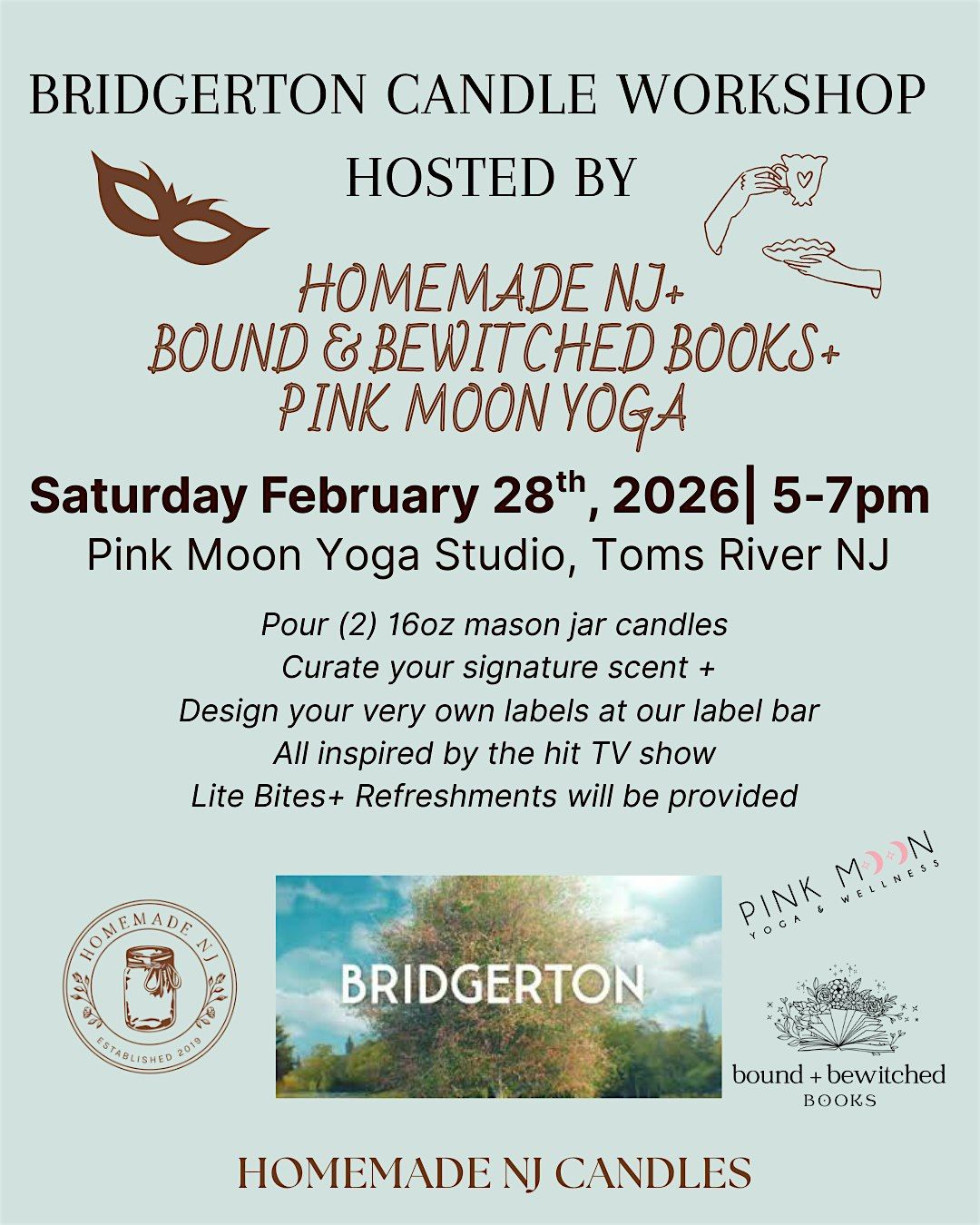 Crafting Experience: Curate your own SIGNITURE scent, Pour (2) 160z mason jar candles that will burn 60-70 hours long, Design your own labels to make a lasting memory! You will have the opprotunity to design your candle based on the hit sereis Bridgerton!