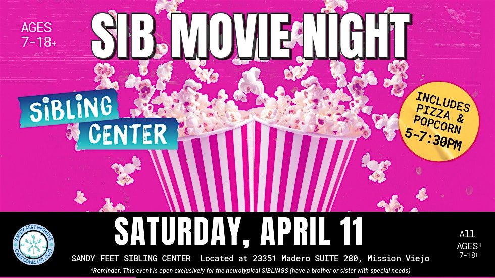 Drop your sib kids off (Young Adults Carpool!) to our NEW Sandy Feet Initiative Sibling Center for SATURDAY NIGHT & A MOVIE, APRIL 11th, 5pm - 7:30pm.