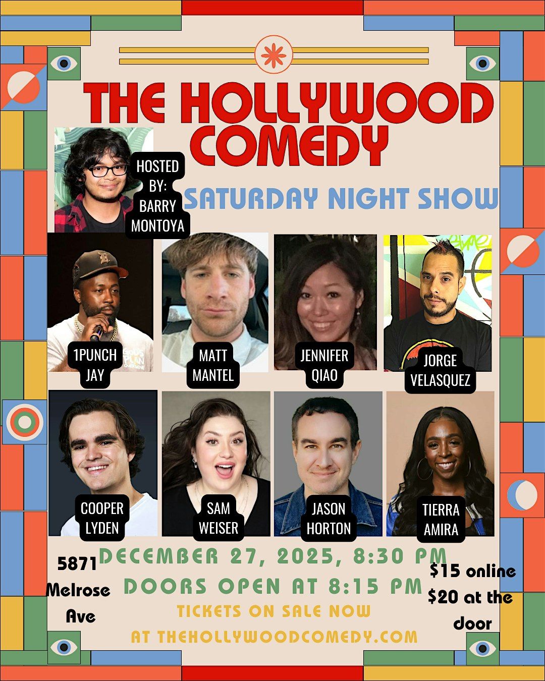 Welcome to **SATURDAY NIGHT COMEDY AT THE HOLLYWOOD COMEDY **! Get ready to laugh your socks off at this hilarious event happening at The Hollywood Comedy. Join us on **Saturday, December 27th, 2025** at **8:30** for a night full of gut-busting comedy performances by talented stand-up comedians. Don't miss out on the chance to unwind and have a great time with friends or family. Ages 18+ admitted. Get ready for a night of non-stop laughter and entertainment at The Hollywood Comedy! See you there!