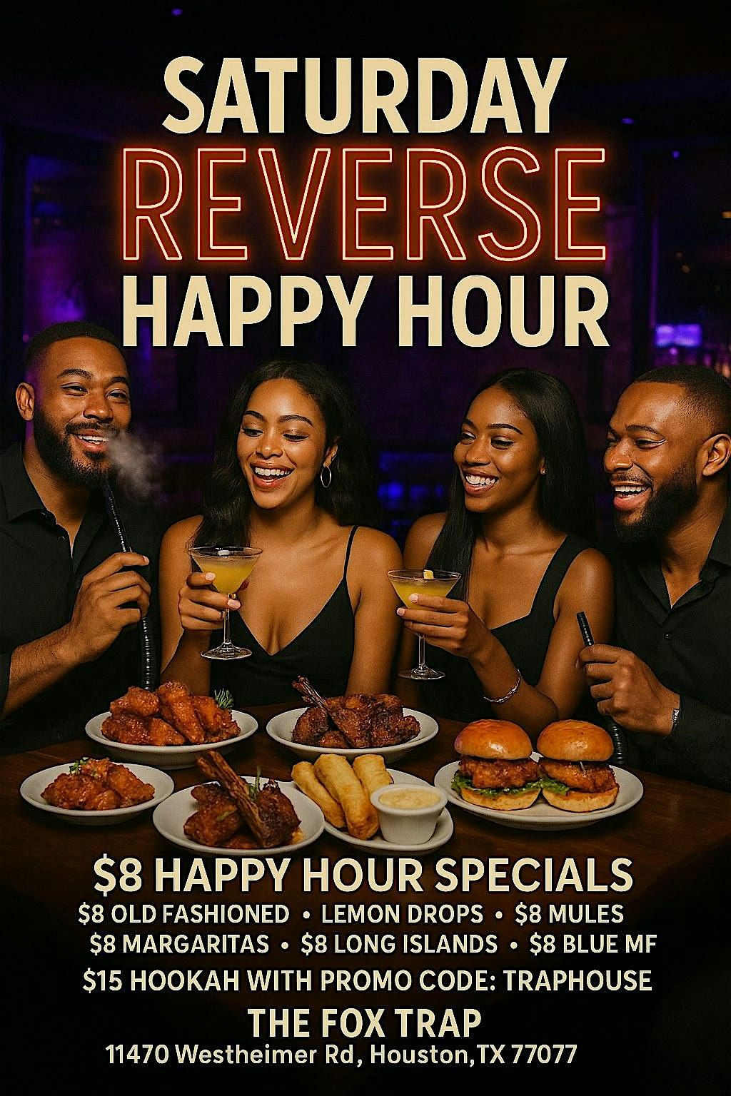 Welcome to the Saturday Night Dinner Vibes event at The Fox Trap Restaurant & Lounge! Get ready for a night filled with Live DJ music, NBA Games on big screens, $15 Hookahs, and fun Pool Tables. Don't miss out on this fantastic opportunity to enjoy great food, music, and entertainment with friends and family. See you there!
