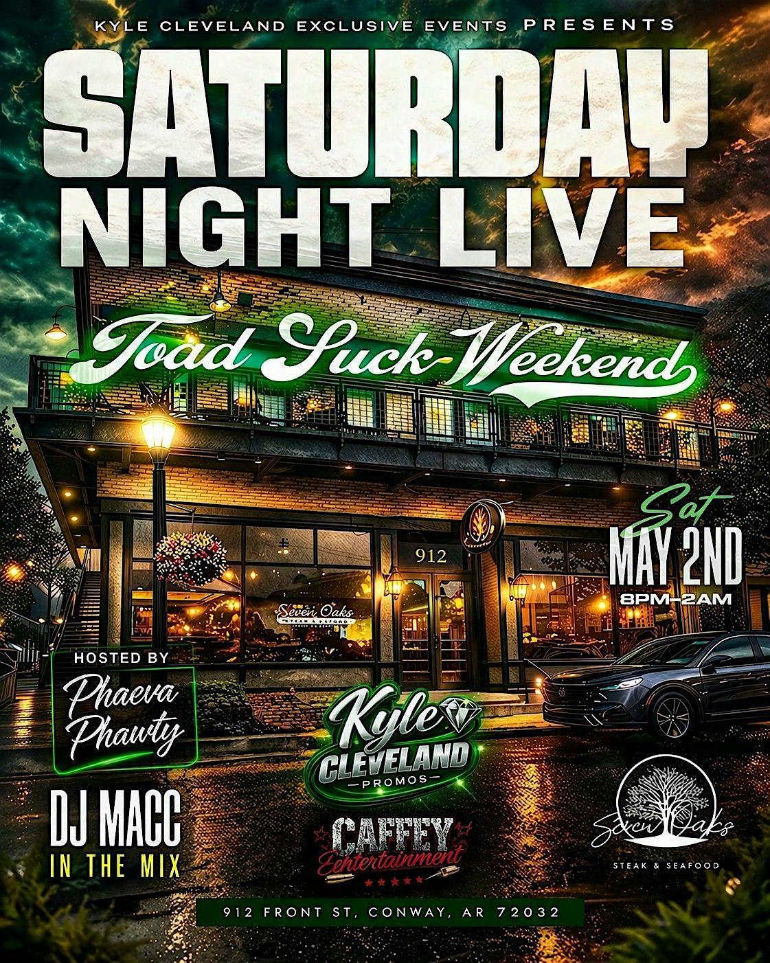 CONWAY… WE TURNING UP TOAD SUCK WEEKEND, we going ALL THE WAY UP! Kyle Cleveland Exclusive Events presents SATURDAY NIGHT LIVE....DJ MACC IN THE MIX...Hosted by Kyle Cleveland, Phaeva Phawty, & Nigel Caffey.Saturday May 2nd 8PM–2AM, Seven Oaks Steak & Seafood 912 Front St • Conway, AR Grown Vibes Only. Packed building & Nothing but good energy all night! #ToadSuckWeekend #ConwayAR #SaturdayNightLive