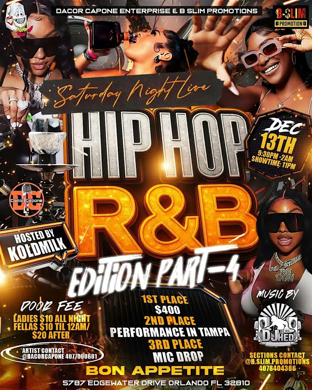 Info: Saturday Night Live Hip hop showcase part 4.1st place ? $400 cash . 2nd place prize performance in Tampa, 3rd place Mic drop.