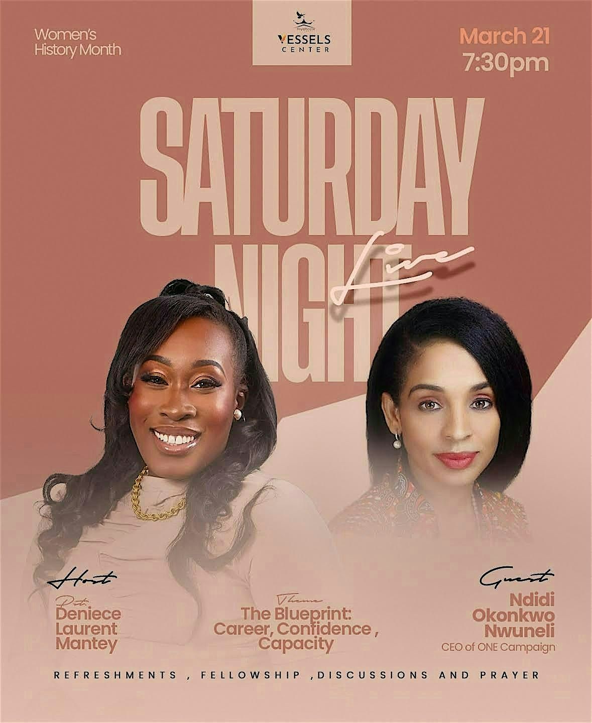 Join us for a special Saturday Night Live (SNL) gathering on Saturday, March 21 at 7:30 PM as we celebrate Women’s History Month with an evening of powerful conversation, fellowship, and inspiration.