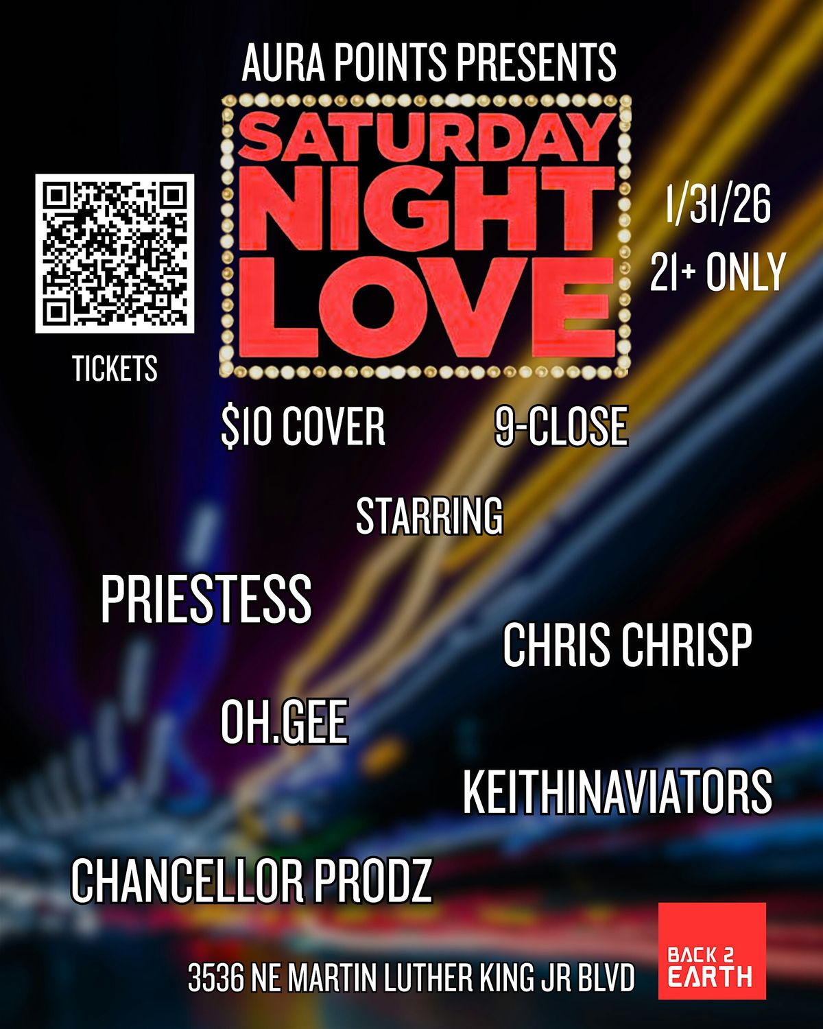Aura Points presents a feel-good night of grooves and energy on 1/31/26 at Back 2 Earth. From 9–close, we’re bringing together an eclectic lineup featuring Priestess, Chris Chrisp, Oh.Gee, Keithinaviators, and Chancellor Prodz — delivering a mix of house, hip-hop, techno and late-night lounge vibes all night long.