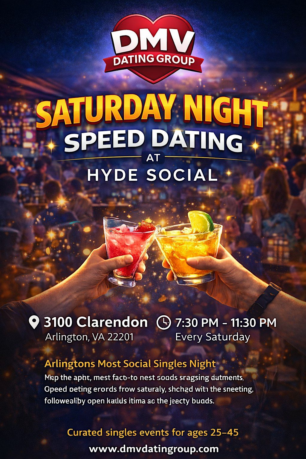 Join us for Saturday Night Speed Dating at Hyde Social in Arlington, Virginia β a high-energy singles event designed to help you meet new people in one of Clarendonβs most vibrant nightlife venues.
