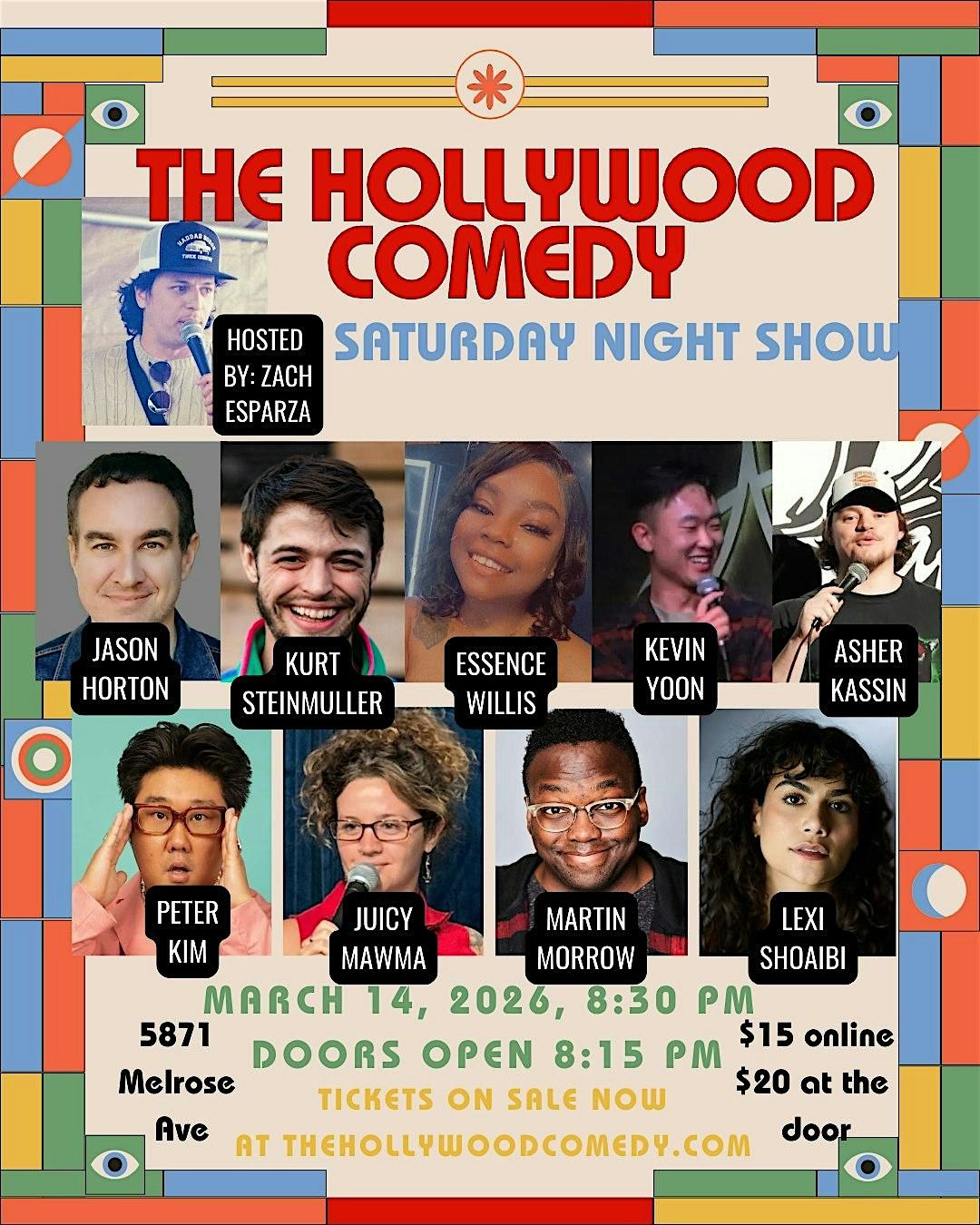 Welcome to **SATURDAY NIGHT COMEDY AT THE HOLLYWOOD COMEDY **! Get ready to laugh at this hilarious event happening at The Hollywood Comedy. Join us on **Saturday, March 14th, 2026** at **8:30** for a night full of incredible comedy performances by talented stand-up comedians. Don't miss out on the chance to unwind and have a great time with friends or family. Ages 18+ admitted. Get ready for a night of unbeatable entertainment at The Hollywood Comedy! See you there!
