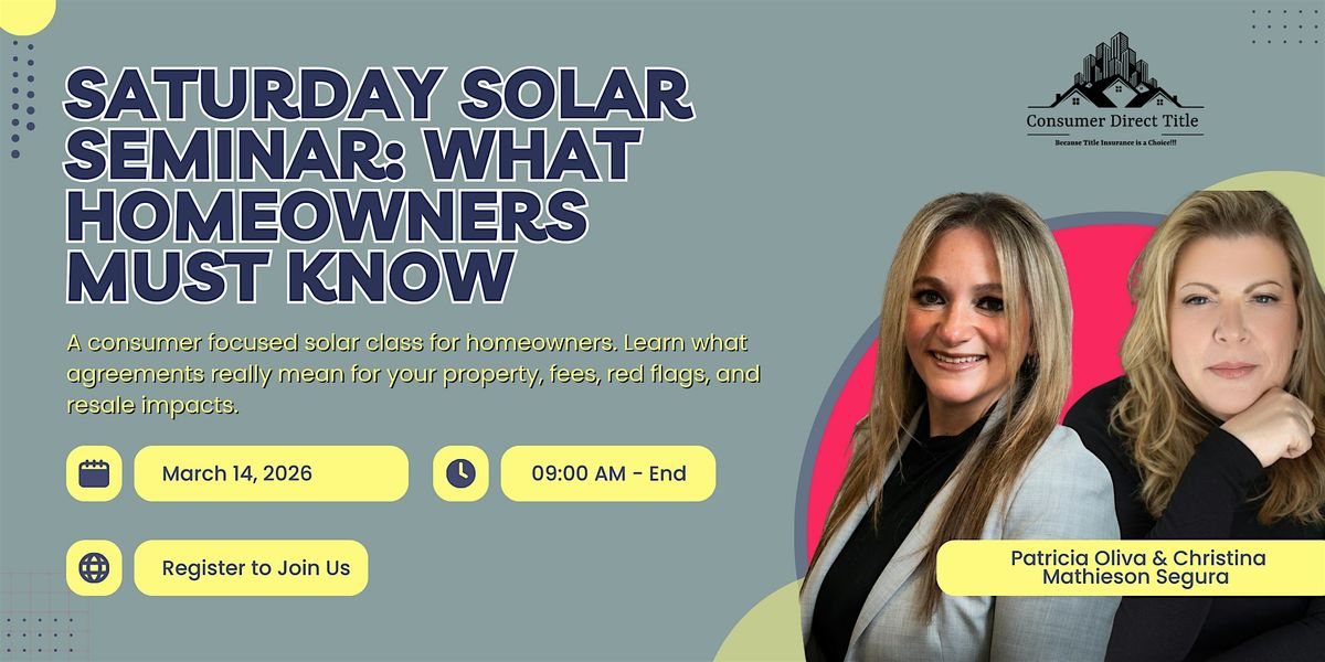 Solar can be a great option for some homeowners, but the paperwork matters. Join Patricia Oliva and Christina Mathieson Segura for a clear, practical seminar that breaks down the real terms inside solar agreements, what they can mean when you refinance or sell, and how to spot red flags before you sign.