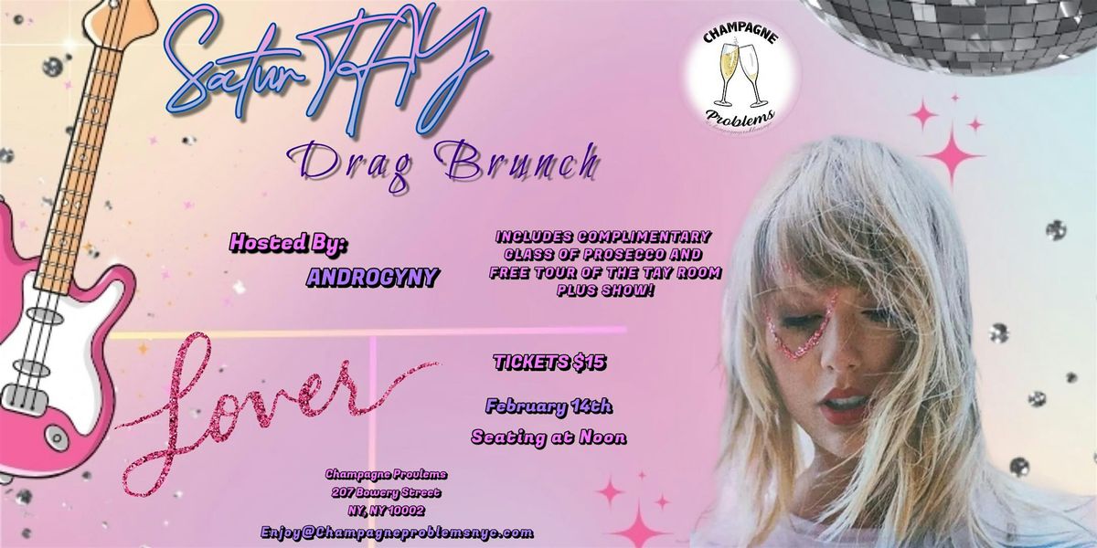 Come join us at Champagne Problems for our Taylor Swift LOVER themed Brunch on Valentines Day!!!! Hosted by Androgyny. Your ticket includes a complimentary glass of prosecco, a VIP tour of our Taylor room, and a show! We will be doing songs from her LOVER album plus some of our favorite Taylor numbers. We will be playing games, dancing, laughing our butts off, and having the best Valentines Day brunch around. We have amazing cocktails, delicious food, and a bar with a dance floor ready to party after the show. Seating is limited and reservations are a must. Be sure to get your tickets now before they sell out!