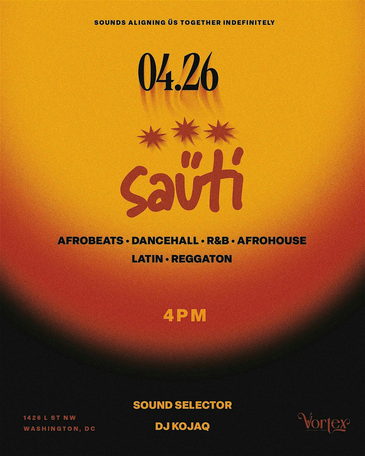 SAUTI is a curated dining and sound experience rooted in Afrobeats, Dancehall, R&B, and Afrohouse. Held at the Vortex Lounge in the heart of Washington, DC, this is an afternoon built for those who don't just attend events — they live them.