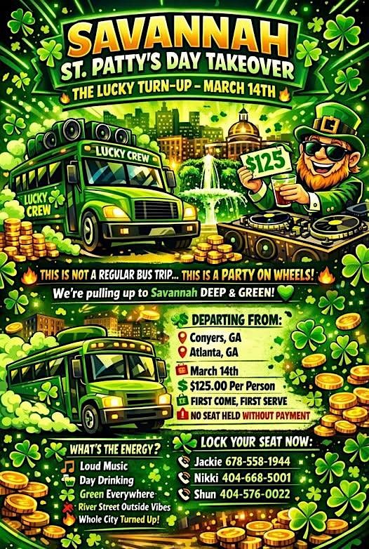 Get ready to celebrate St. Patty’s Day like never before in Savannah! Join us on March 14, 2026 at 7:00 AM (Eastern Time) for an unforgettable in-person party filled with good vibes, great people, and tons of fun. Don’t miss out on the chance to make some awesome memories and enjoy the festive spirit up close and personal!