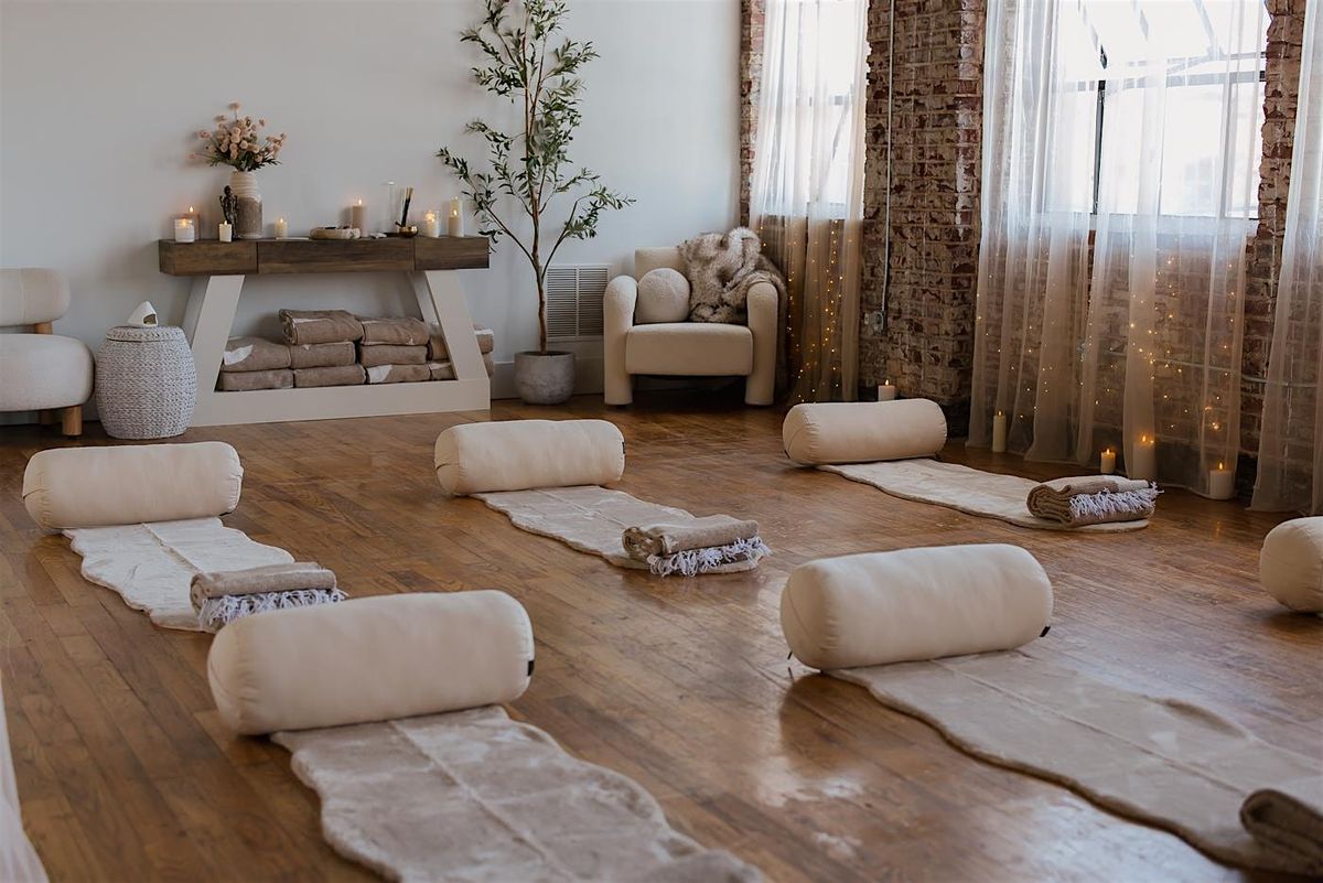 You’ll step into our cozy studio where you’ll be greeted with a cup of relaxing kava tea, and soft meditative music before you settle into your rest space (bolsters, blankets and eye masks provide). We’ll come around with a warm lavender infused towel or weighted eye pillow to induce a state of relaxation as you get comfortable and prepare to close your eyes and just let it all go. This offering is intentionally limited to 6 women per ritual to allow for energetic breathing room. You’ll also have the option of receiving shoulder grounding and rocking assist while in savasana (consent chips speak for you so you don’t have to).