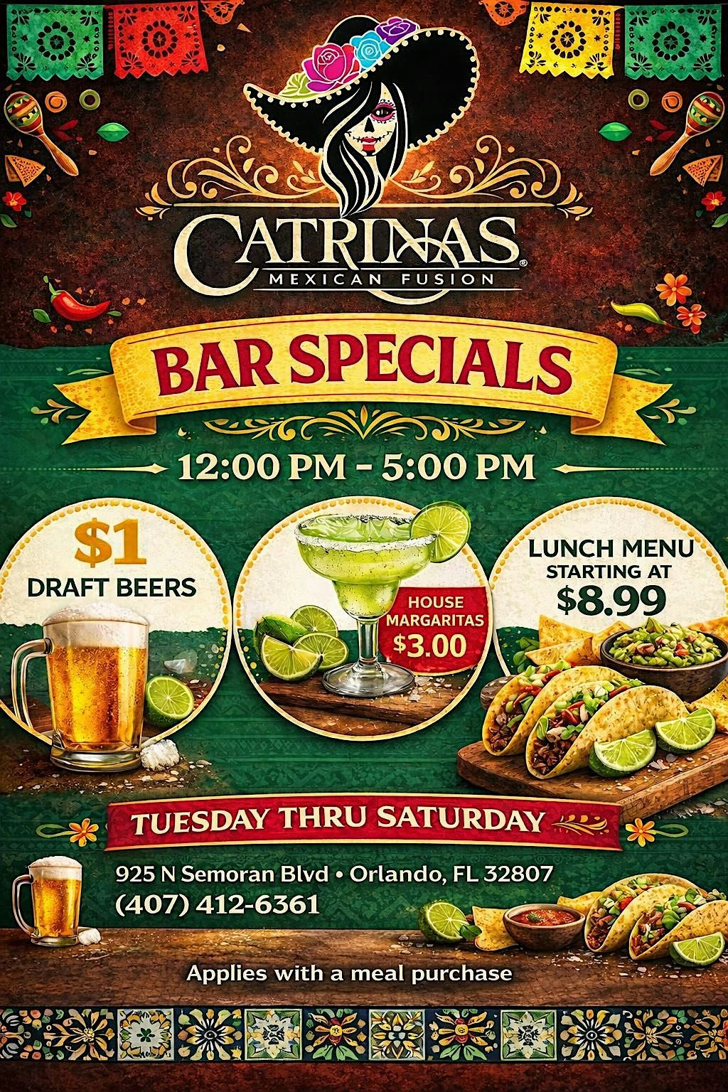 Come join us at Catrinas Mexican Fusion for a fun and relaxing happy hour event! Indulge in delicious cocktails and mingle with fellow cocktail enthusiasts.