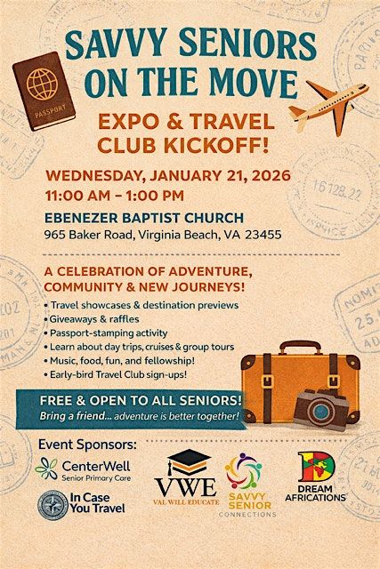 Join us at the Savvy Seniors On The Move-Travel Club Kick-Off&Expo for an adventure-filled day of travel tips and wanderlust inspiration!