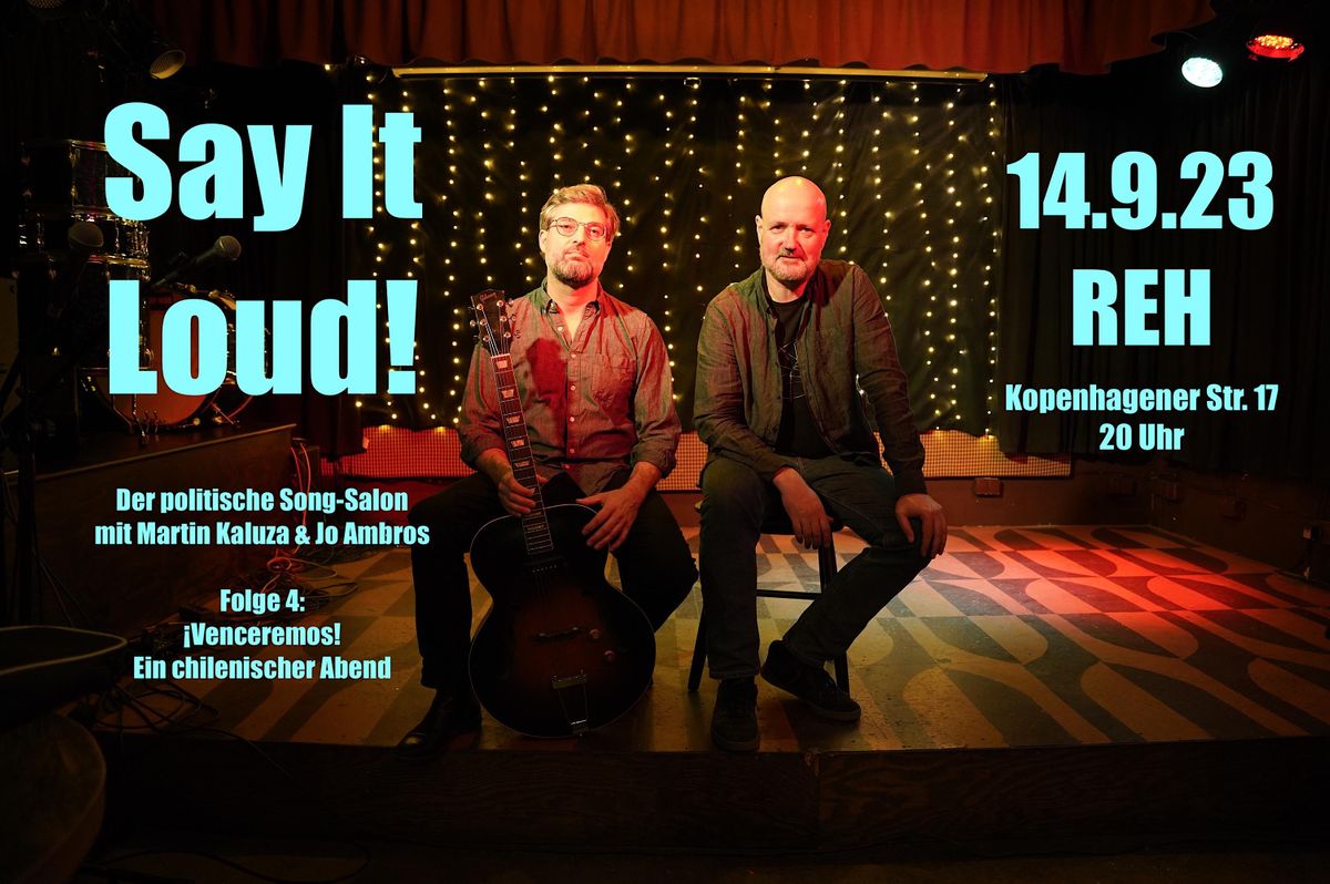 In der Bühnenshow „Say It Loud! Der politische Song-Salon“ dreht sich alles um Protestsongs, Revolutionslieder, Arbeiter- und überhaupt engagiertes Liedgut. In unregelmäßiger Folge treten der Journalist Martin Kaluza und der Gitarrist Jo Ambros in Berlin auf. Kaluza liest Texte aus seinem Blog, Ambros spielt Gitarre, dazu schaut man Videos, und gesungen wird gerne und laut. Lutz Weinmann ist am Kontrabass zu Gast.