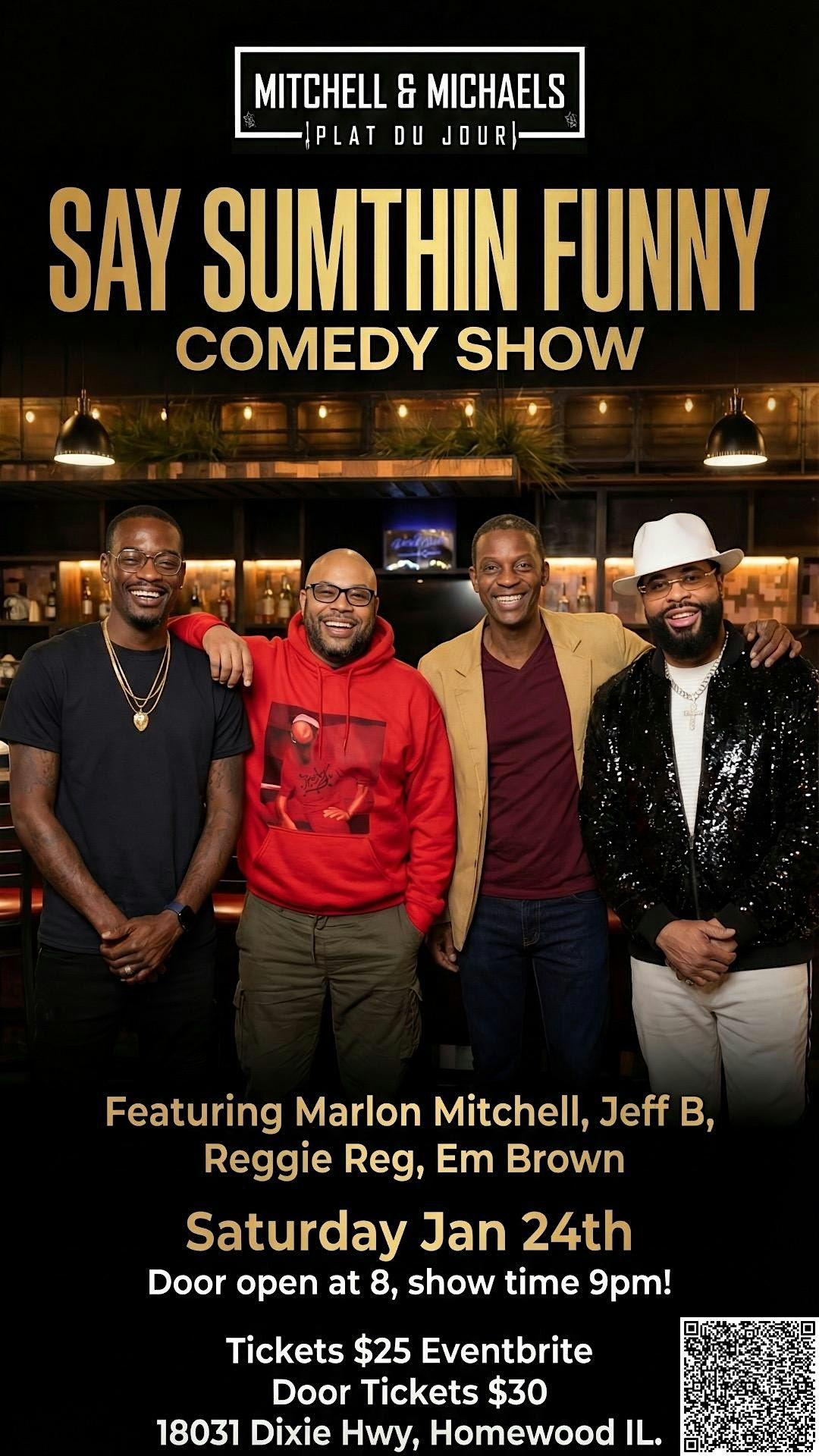 Mitchell & Michaels Plat Du Jour presents the “Say Sumthin Funny” comedy show! Marlon Mitchell, Comedian Jeff B, Reggie Reg, and Em Brown.About this Event