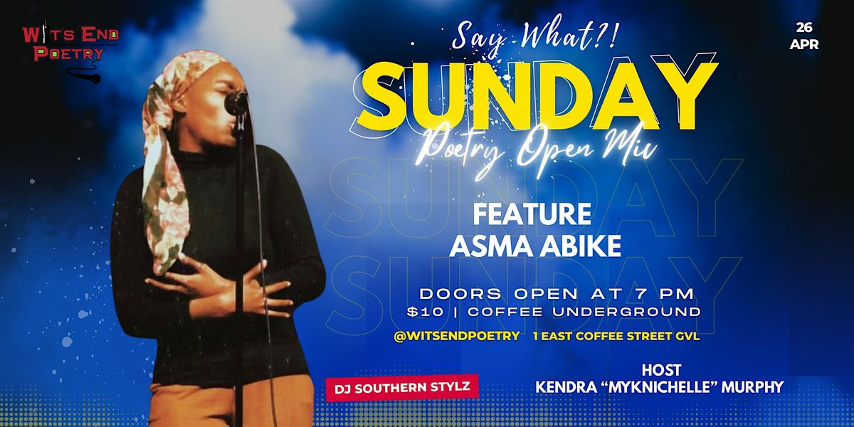 Say What Open Mic at Coffee Underground! featuring Asma Abike. All poetry styles welcome: page or stage! Open Mic slots for local poets on a first-come, first serve basis. Open mic poets may read/recite one poem and share their instagram/website - see below for more details. Host Kendra “myknichelle” Murphy.