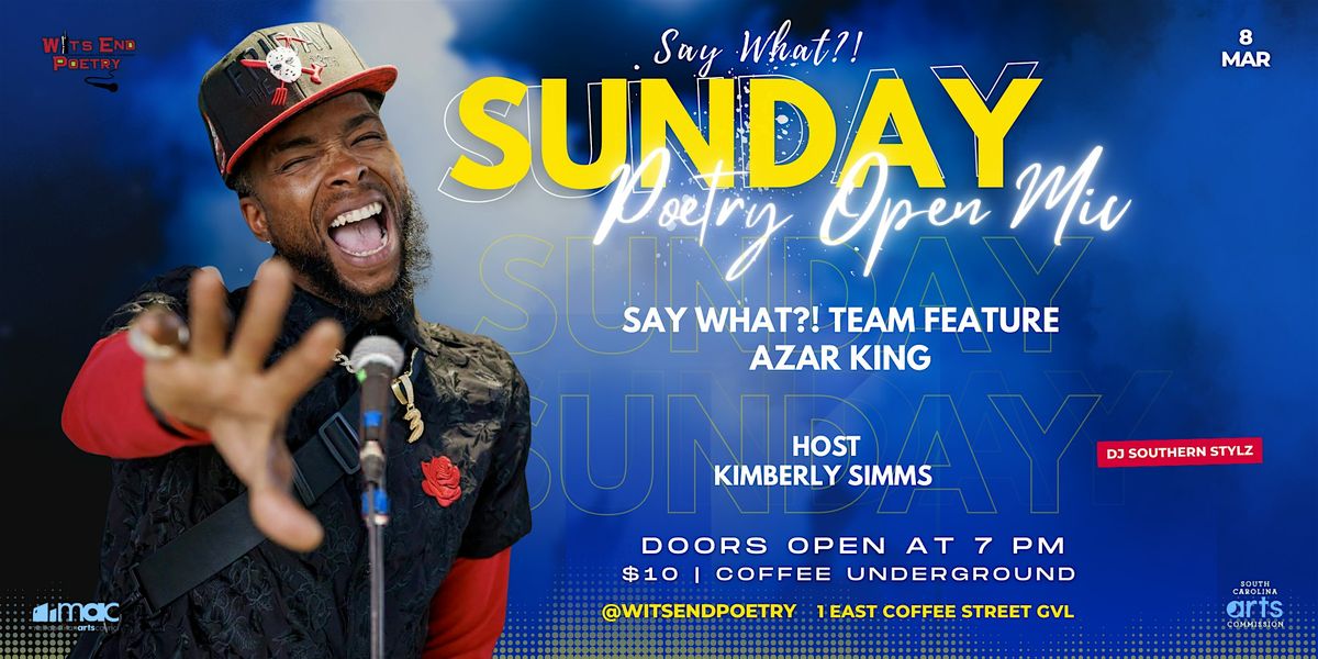 Say What?! Open Mic at Coffee Underground featuring team member Azar King of Greenville, SC! All poetry styles welcome! The night will also feature a full night of open mic slots for local poets on a first-come, first serve basis. Host Kimberly Simms.