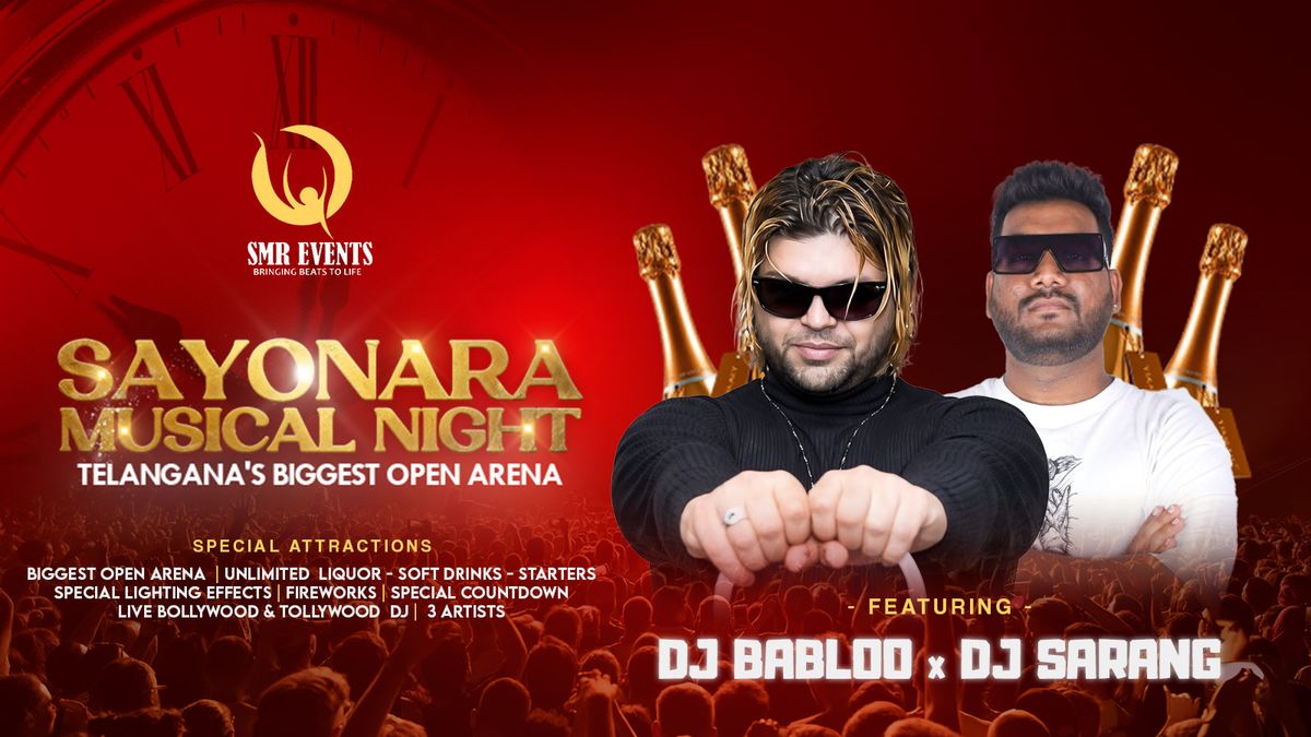 SAYONARA MUSICAL NIGHT – New Year’s Eve 2026 ✨Get ready to welcome the New Year with a bang at Telangana’s Biggest Open Arena Celebration! 🎉🔥SMR Events proudly presents an unforgettable night filled with high-energy music, massive crowd vibes, and grand celebrations.🎧 Featuring:DJ BABLOO x DJ SARANG – spinning the best of Bollywood & Tollywood beats all night long!🗓 31st December | ⏰ 8:00 PM onwards📍 Venue: Hyderabad Advocates Mutually Aided Society – Open LandNear Uppal Shilparamam | Behind D-Mart Uppal Bhagyanth Phase-2✨ Special Attractions:* Biggest Open Arena* Unlimited Liquor, Soft Drinks & Starters 🍾* Special Lighting Effects & Fireworks 🎆* Grand New Year Countdown 🕛* Live DJs & 3 Artists on Stage