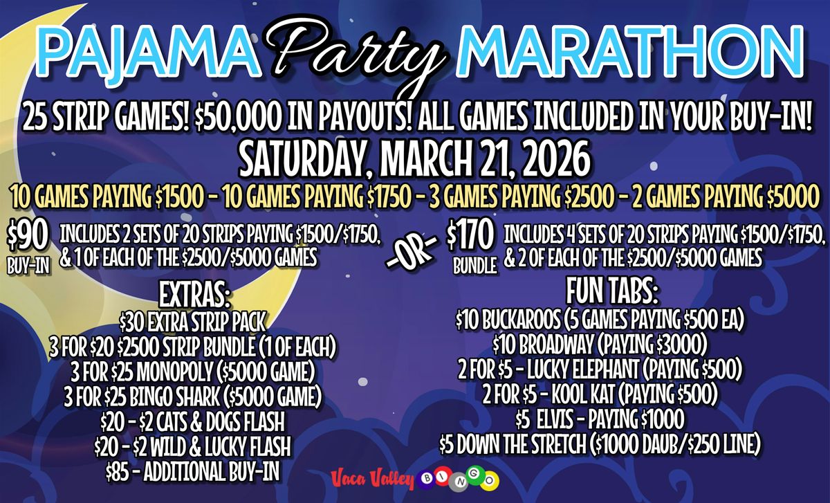 $90 BUY-IN INCLUDES: 2 SETS PF 20 STRIPS PAYING OUT $1500/$1750 & 1 EACH OF THE $2500/$5000 GAMES