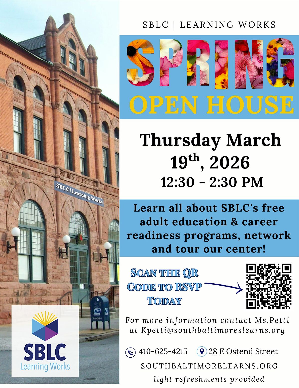 Join us for an exciting virtual open house! At SBLC|Learning Works, we're all about creating a fun and engaging learning environment. Whether you're a student, parent, or educator, this event is perfect for you. Discover our innovative programs and meet our passionate team. Get a glimpse of our historical building and activities. Don't miss this opportunity to connect with like-minded individuals who are passionate about education.