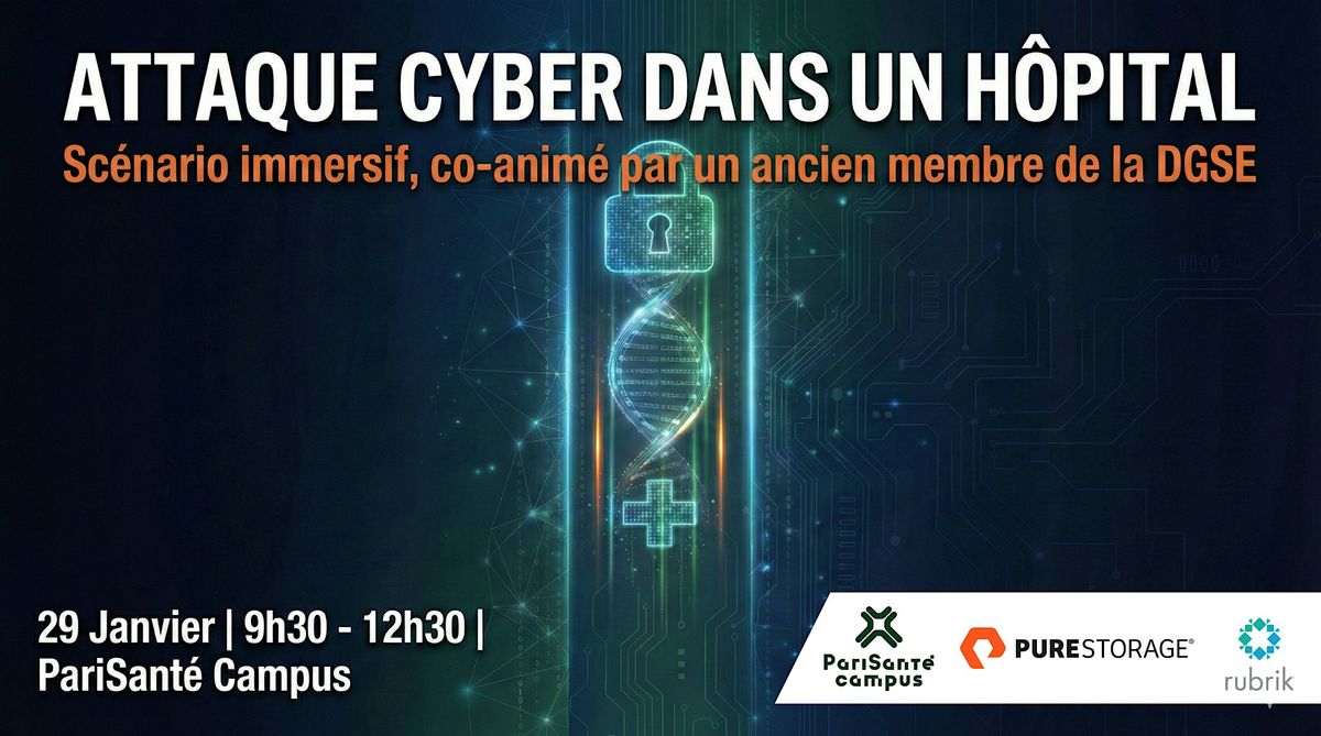 Parce que se préparer à ces situations, c’est réduire le risque, PariSanté Campus, Pure Storage et Rubrik s’associent pour proposer un événement exceptionnel : une immersion grandeur nature dans un scénario d’attaque, inspiré d’un cas réel et co-animé par un ancien membre de la DGSE.