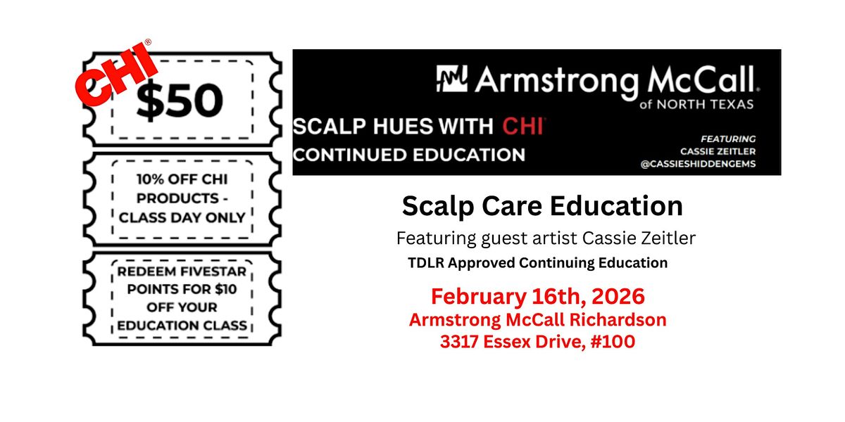 Welcome to Scalp Hues with CHI Continuing Education happening at Armstrong McCall in Richardson on February 16, 2026 at 10:00 AM (Central Time)! Get ready for a day filled with learning, creativity, and networking. This event is perfect for beauty professionals looking to enhance their skills in grey coverage and knowledge in scalp treatments. Don't miss out on this opportunity to grow in your craft and get some CE hours.