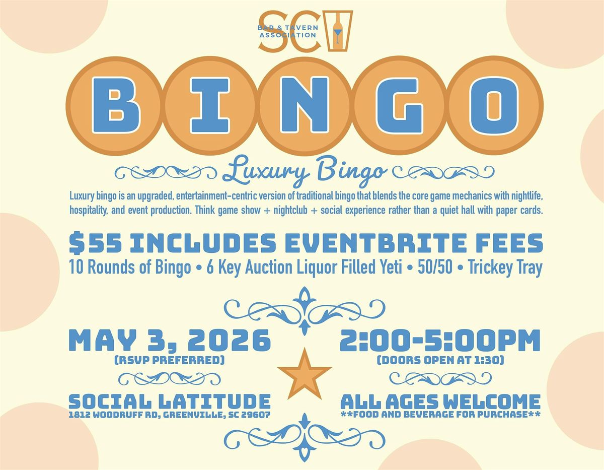 Get ready for a fun night out at the Luxury Bingo event, supporting the SC Bar & Tavern Association. This in-person gathering is the perfect way to enjoy some games, meet great people, and contribute to a fantastic cause. Don’t miss your chance to be part of this exciting evening filled with laughs, prizes, and good vibes. Bring your friends and let’s make it a night to remember!