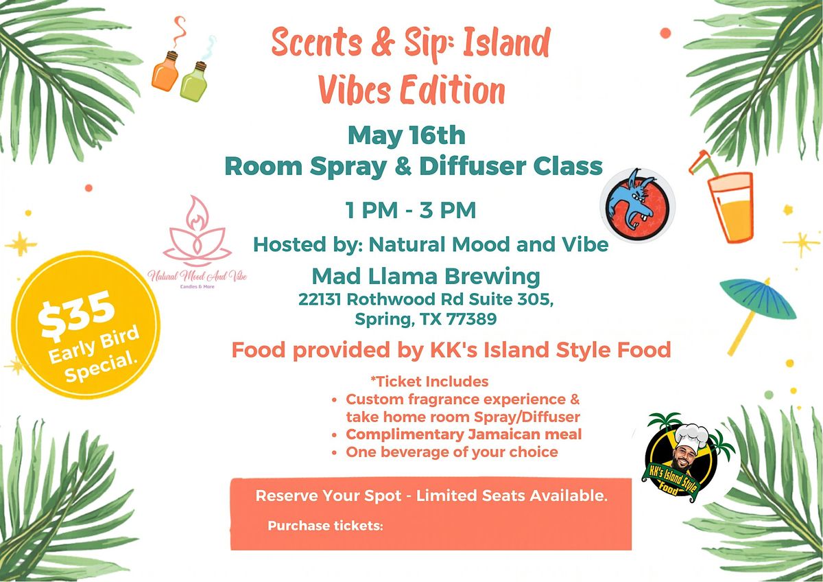 Join KK’s Island Style Kitchen for our Scents & Sip Experience — where creativity meets Caribbean flavor! At this hands-on class, you’ll craft your own custom room spray or diffuser using a selection of signature scents, all while enjoying delicious, authentic Jamaican-inspired food.