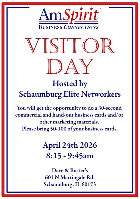 If you are a local business looking for networking connections and more referrals, the referral & visitors day event will be a great opportunity for you! The Schaumburg Elite Networkers chapter of Amspirit Business Connections is hosting this free event as a fantastic opportunity to expand your network and make meaningful business connections. This in-person event is the perfect place to meet like-minded professionals, share ideas, and grow your business. Whether you're a seasoned entrepreneur or just starting out, this event is for you. Be sure to bring 50+ business cards to ensure all attendees grab your information!