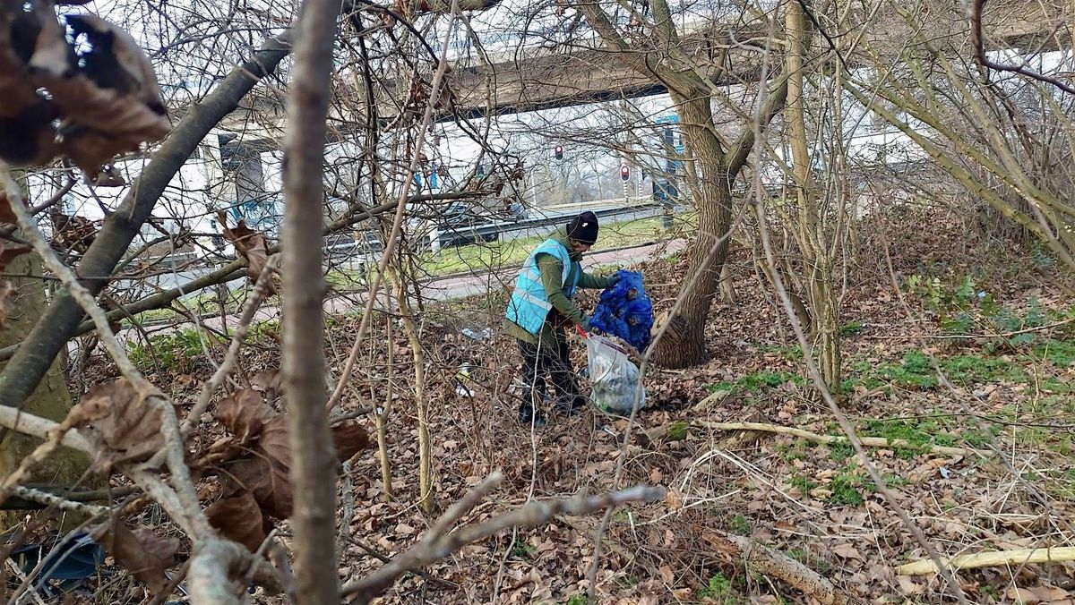 Het schoonmaken van de stadsnatuur rondom het enorme verkeersplein bij de A20 is een flinke klus. Daarom knippen we het op in meerdere clean ups.