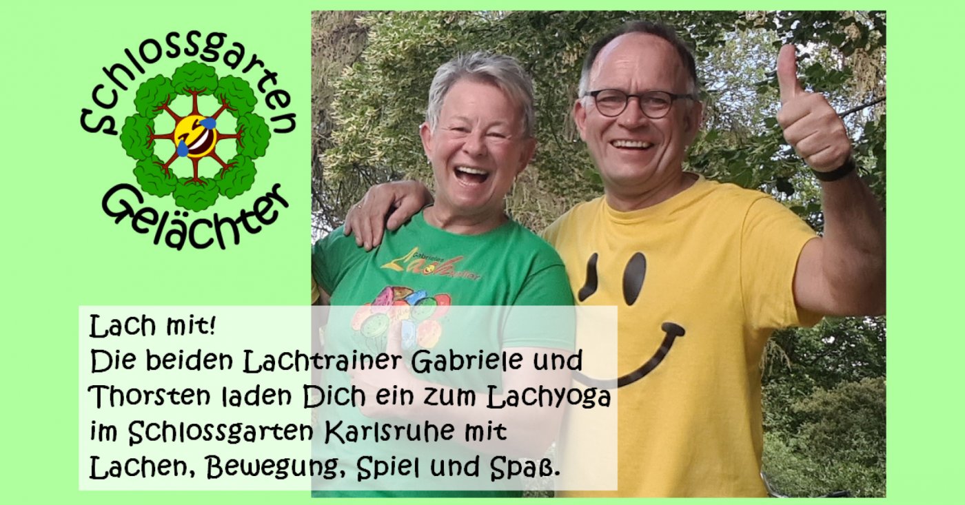 Die beiden Lachtrainer:innen Gabriele und Thorsten laden einmal monatlich alle Interessierten an jedem dritten Sonntag eines Monats jeweils um 11 Uhr zu einer Stunde Lachyoga im Karlsruher Schlossgarten ein.