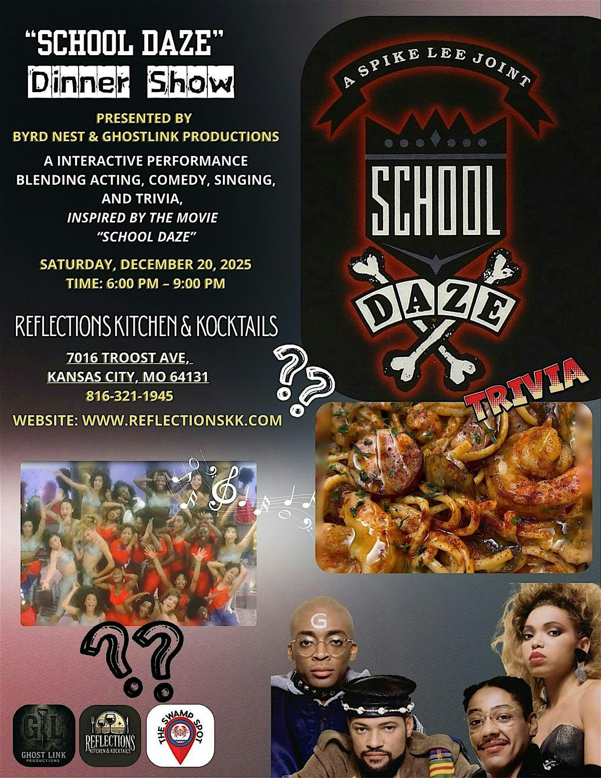 Step into the culture, comedy, and chaos of college life with School Daze, an interactive dinner experience inspired by the iconic Spike Lee film.