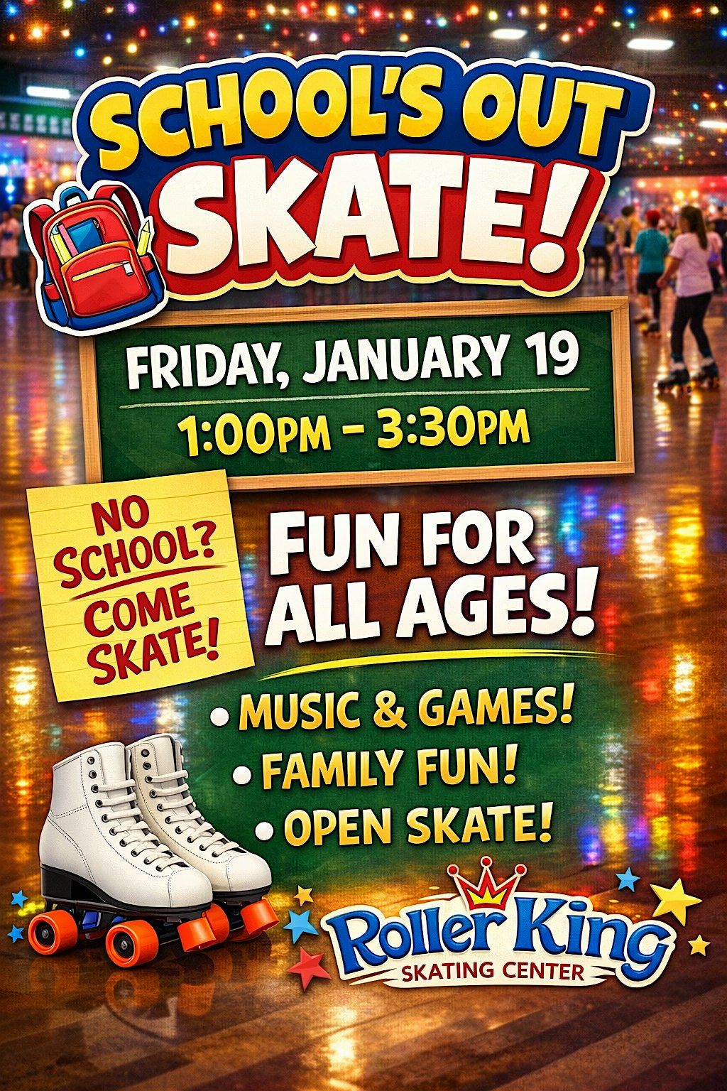 Roller King is open for skating on Jan 19th from 1:00-3:30 pm